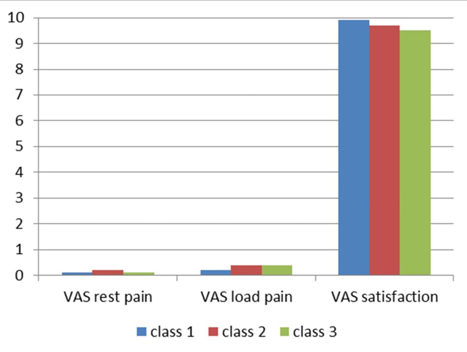 Major systemic and wound healing problems were seen more often in the obese patients (Figure 3). But no significant differences were seen between the classes respective the clinical outcome. Pain at rest and under load was measured with the visual analog scale (VAS) (Figure 4).