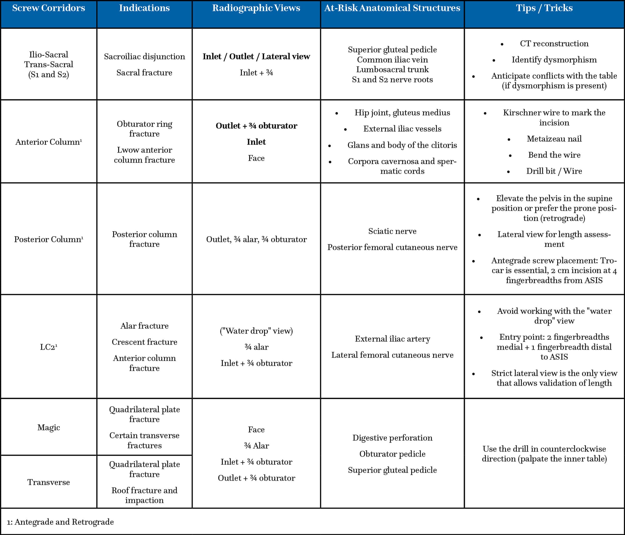 The various fixation corridors, their indications, the required radiographic views, as well as the anatomical structures presenting a risk of adjacent complications, along with techniques and potential aids to facilitate their implementation, are described for each of them in the following paragraph and summarized in Table 1.