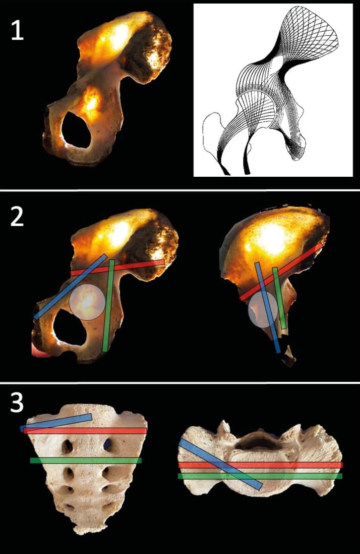 The coxal bone is structured as a flat bone, composed of trabecular tissue enclosed between two layers of cortical tissue. Its role in standing and sitting positions requires an architecture adapted to these two functions, as found in all other skeletal structures, with a specific arrangement of bone trabeculae in response to the pressures experienced and transmitted by the bone. According to the work of anatomists Latarjet and Gallois, the architecture of the pelvis is organized into two distinct systems. The first extends from the auricular facet to the acetabular cavity and is adapted to standing or walking: it consists of sacro-acetabular trabeculae. The second, starting from the same surface and ending at the ischium, is adapted to the sitting position: it is formed by sacro-ischiatic trabeculae. These bone trabeculae are the basis for Letournel's theory of acetabular columns and the corridors described for percutaneous surgery (Figure 1).