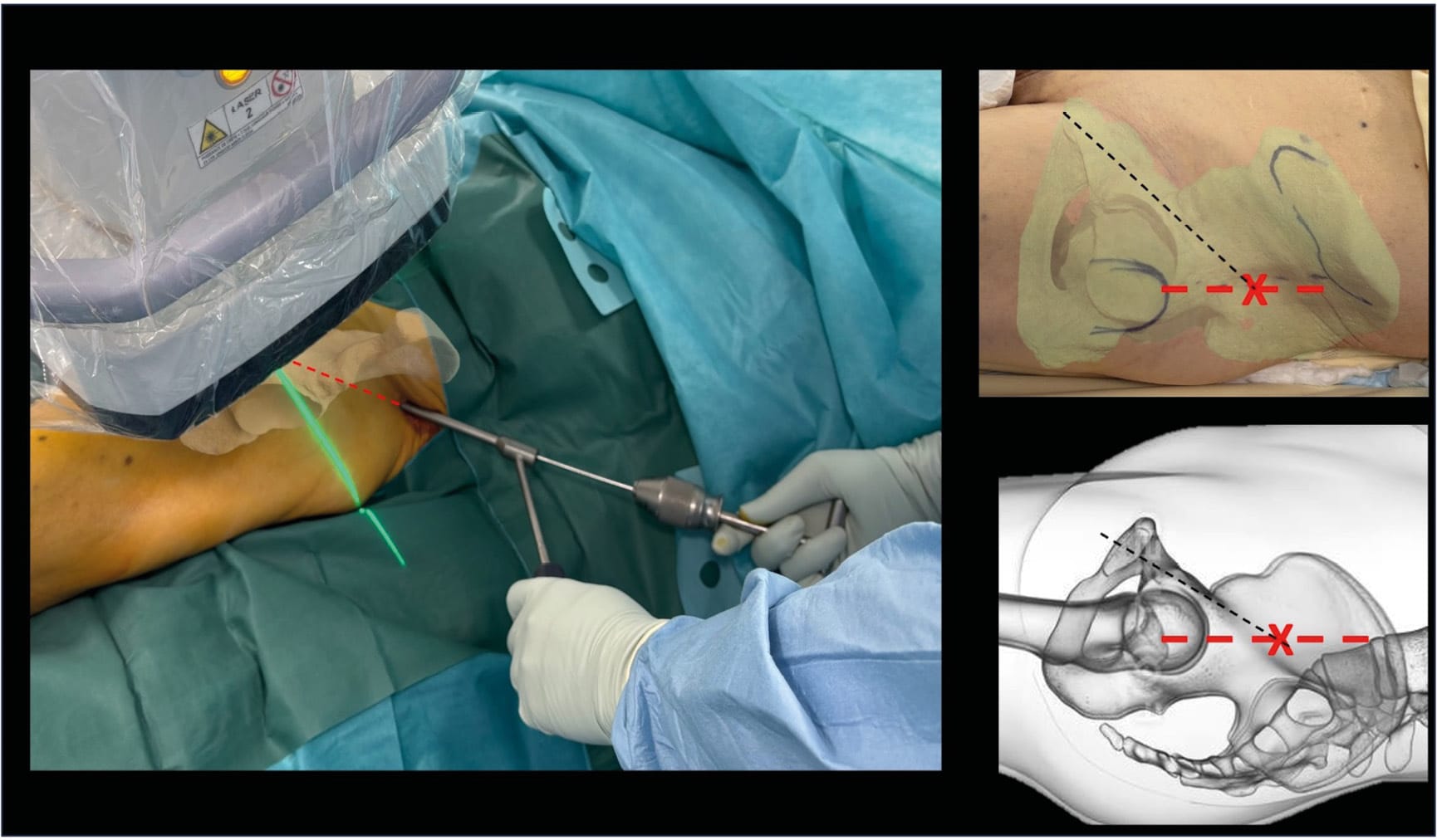 The hourglass-shaped bone corridor connects the anterior inferior iliac spine (AIIS) to the posterior superior iliac spine (PSIS). Several screw trajectories can utilize this corridor [19] Giannoudis PV, Tzioupis CC, Pape H-C, Roberts CS. Percutaneous fixation of the pelvic ring: AN UPDATE. J Bone Joint Surg Br 2007;89-B:145–54. https://doi.org/10.1302/0301-620X.89B2.18551.. Here, we will detail the most commonly used trajectory, which offers maximum safety.