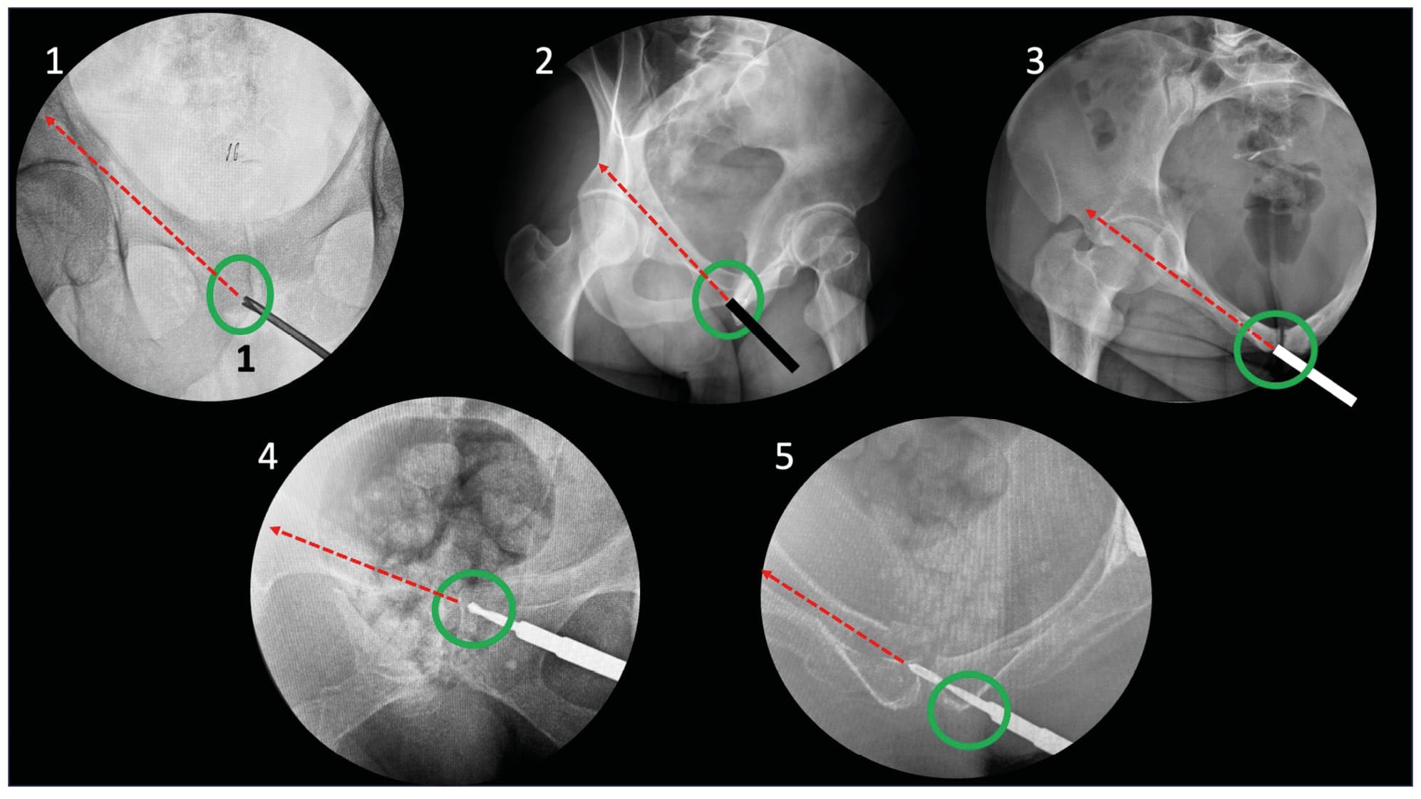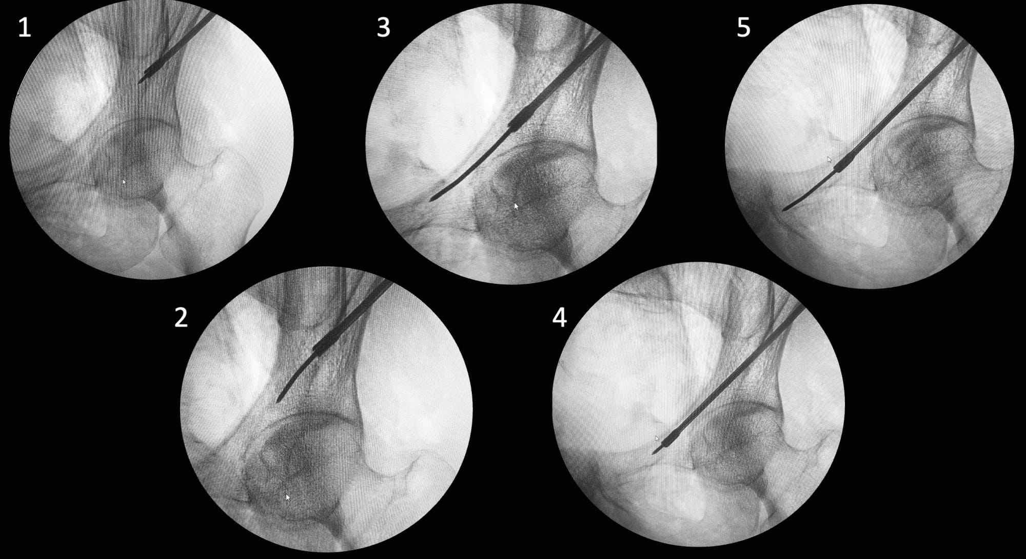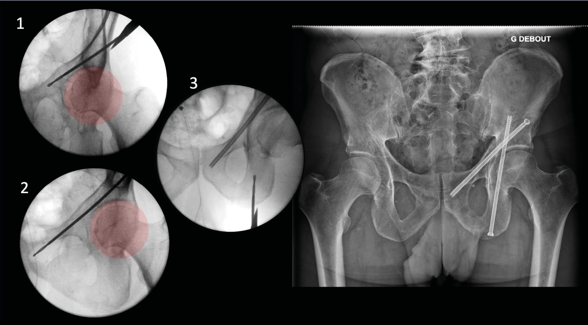 Then, the image intensifier is positioned for inlet plus three-quarter obturator view to manage trajectory convergence. The guide wire is then advanced through the corridor, alternating between these two views to check for absence of false passages. Once the guide wire is advanced to the desired position, a teardrop view is performed to confirm proper positioning within the corridor. A lateral view verifies the length. Subsequently, a screw of the desired length is inserted.