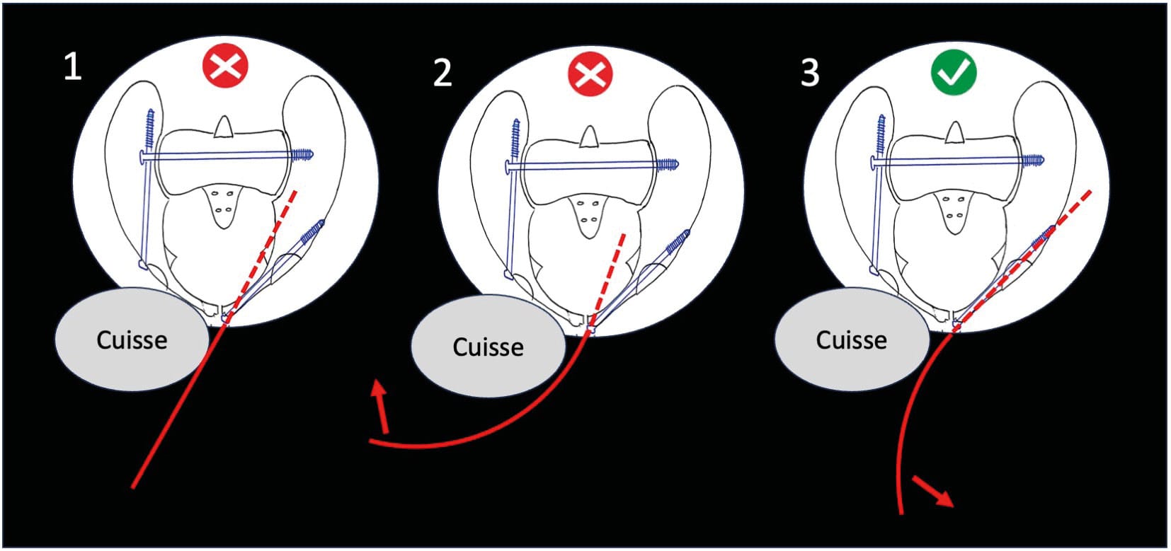 Also called the "external-internal posterior column screw," this technique was described in the early 2000s. Its execution is complex and requires perfect mastery of bone anatomy. It is indicated in certain transverse fractures, as a complement to or replacement for a posterior column (PC) screw. Like the supra-acetabular screw, it allows for maintaining a previously reduced quadrilateral plate fracture. Its entry point is similar to that of a transverse supra-acetabular screw, visible on an outlet view plus obturator oblique view. Its anteroposterior direction requires an iliac oblique view; on this view, its trajectory must be directed toward the ischial spine, away from the joint. The guide wire progression is also monitored through anteroposterior, obturator oblique, inlet, and outlet views (Figure 3). The same technique described for the supra-acetabular screw is strongly recommended at the end of the procedure to palpate the internal table of the posterior column. The iatrogenic risks are similar to those described for the supra-acetabular screw, with the additional potential risk of sciatic nerve injury.