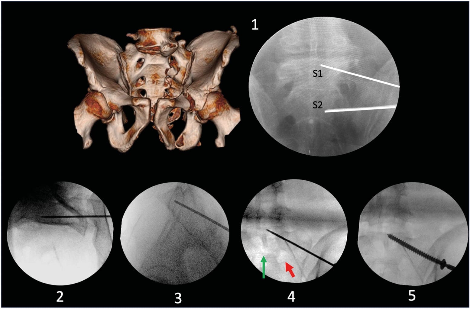 Key Points: Successful percutaneous fixation relies on a precise understanding of sacro-acetabular and sacro-ischiatic trabecular systems. Key corridors include iliosacral, trans-sacral, anterior and posterior columns, and supra-acetabular pathways. Fluoroscopic guidance via Inlet, Outlet, and oblique views is mandatory to navigate these corridors while avoiding neurovascular structures, including the lumbosacral trunk, superior gluteal pedicle, and sciatic nerve. Technical refinements, such as the use of drill-tip guide wires for enhanced tactile feedback and specific reduction maneuvers like the "Metaizeau trick," facilitate accurate screw placement. Large-diameter cannulated screws (6.5 mm to 8.0 mm) are utilized to achieve stable internal fixation. Preoperative planning with three-dimensional imaging is essential to identify anatomical variations, such as sacral dysmorphism, which significantly alter safe screw trajectories.