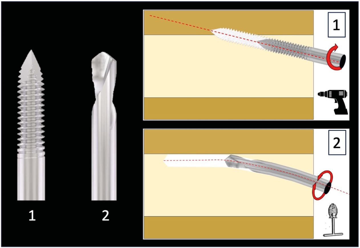 We prefer the use of guide wires with a "drill" tip rather than a "threaded" tip. Indeed, the "drill" wire offers the advantage of being fully dependent on the surgeon's hand (it does not progress with rotation), thus allowing a better feel of the bone densities while allowing a change of trajectory even during progression (Figure 5).