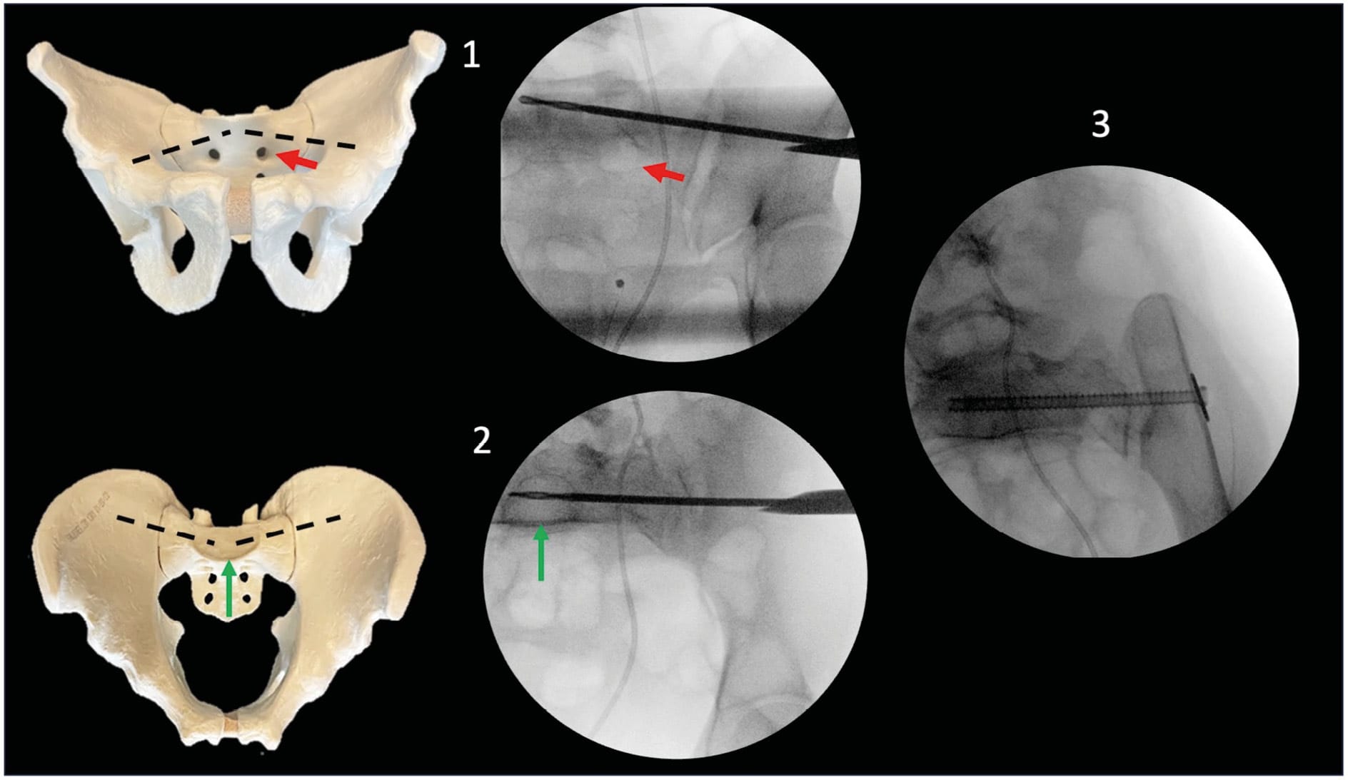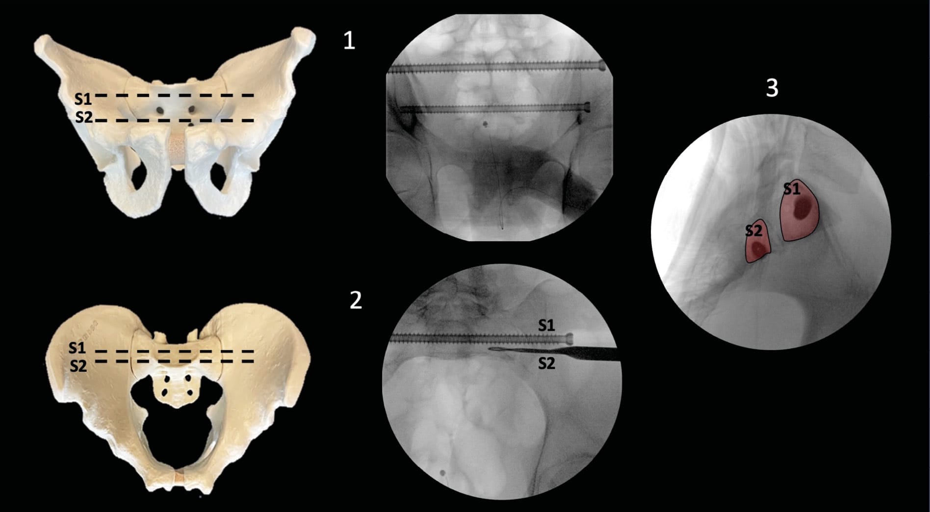 The osseous corridors have been extensively described in the literature, including IS-S1 or S2, TS-S1 or S2, and even S3 in cases of dysmorphism. In non-dysmorphic sacra, only S1 and S2 corridors are accessible, as the inferior portion of the iliac tuberosity ends at the superior aspect of S3. In the presence of dysmorphism, the cranial rearrangement of sacral elements allows access to the S2 and S3 vertebrae.