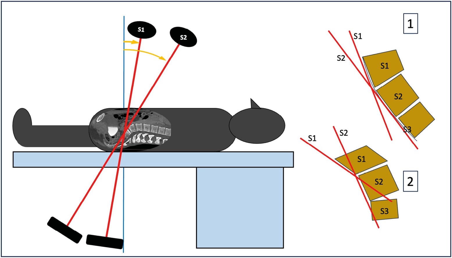 The lumbosacral junction is one of the most variable regions of the spine. Although the total number of vertebrae in the thoracolumbosacral region remains constant, sacral fusion levels differ. It is important to look for radiographic characteristics of dysmorphism, as this variation significantly alters the upper sacrum and therefore the screw corridors (Figure 4). As comprehensively described by Tonetti et al. [1] Tonetti J, van Overschelde J, Sadok B, Vouaillat H, Eid A. Percutaneous ilio-sacral screw insertion. Fluoroscopic techniques. Orthop Traumatol Surg Res 2013;99:965–72. https://doi.org/10.1016/j.otsr.2013.08.010., the following characteristics should be sought: