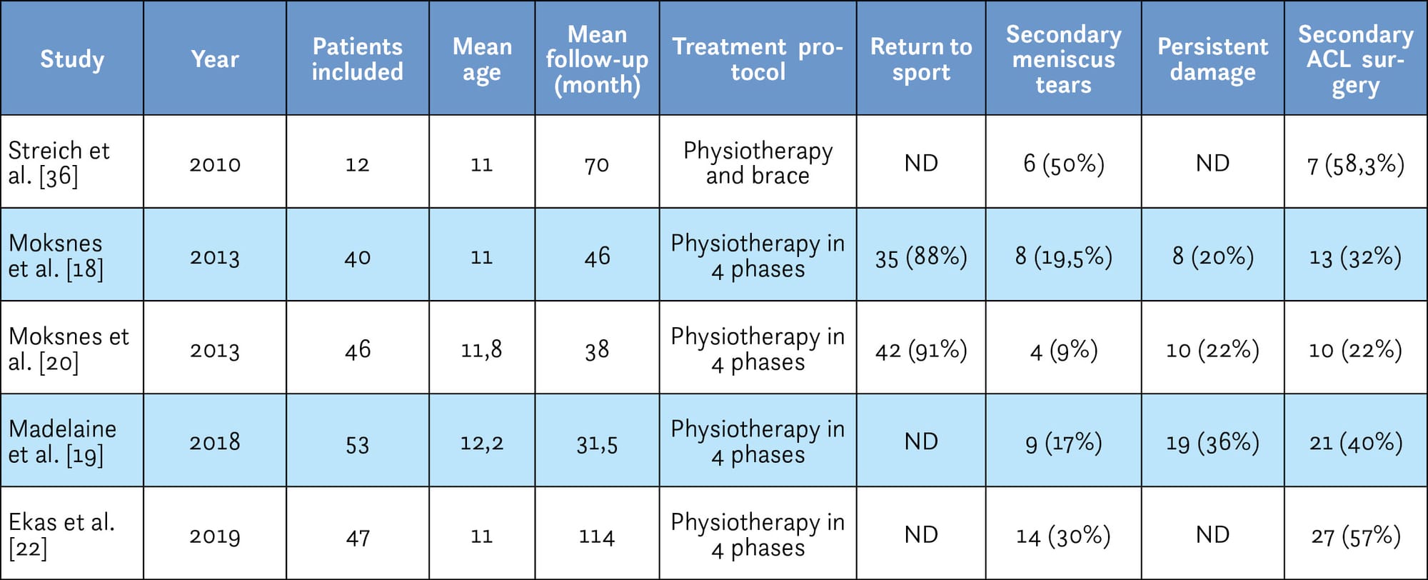 Moksnes et al.[18] Moksnes H., Engebretsen L., Risberg MA. Prevalence and Incidence of New Meniscus and Cartilage Injuries After a Nonoperative Treatment Algorithm for ACL Tears in Skeletally Immature Children: A Prospective MRI Study. Am J Sports Med 2013;41(8):1771–9. Doi: 10.1177/0363546513491092. prospectively monitored the incidence of meniscus and cartilage tears in a group of 40 patients with an average age of 11 years (41 knees with open growth plates) treated non-surgically with a mean follow-up of 3.8 years. Their physiotherapy protocol permitted resuming activities wearing a custom-made knee brace. 13 knees (32%) underwent surgical ACL reconstruction for one of the three following reasons: persistent instability in spite of the physiotherapy protocol, a symptomatic meniscus tear or the reduction achieved was not acceptable for the activity level required. 8 patients (19.5%) needed surgical management because they developed a meniscus tear during follow-up (6 also had ACL reconstructions and 2 had meniscal suture repair only). In 2018, we published a retrospective study that included 53 patients under 18 years of age (Madelaine et al.[19] Madelaine A., Fournier G., Sappey-Marinier E., et al. Conservative management of anterior cruciate ligament injury in paediatric population: About 53 patients. Orthopaedics & Traumatology: Surgery & Research 2018;104(8):S169–73. Doi: 10.1016/j.otsr.2018.09.001.). In contrast to other studies looking at conservative treatment, there were precise selection criteria: no episodes of instability, or only one, and no meniscus tear warranting consideration for surgery. Ultimately, only 30% of patients managed for ACL tear were enrolled in this conservative protocol. The mean age of patients in the series was 12.2 years and the patients were reviewed over a mean observation period of 31.5 months. All patients initially followed a functional rehabilitation programme and then a gradual return to sporting activities (including pivot sports) without restriction. We reported that 9 patients (17%) presented a secondary meniscus tear and only one patient (2%) needed a secondary meniscectomy. Surgical ACL reconstruction was performed for 21 patients (40%) due to the onset of instability and/or a secondary meniscus tear. Any instability, even if only one single episode, was a factor for later surgery. These observations prompted us to perform more rigorous patient selection and to offer surgery following the slightest instability even if the physiotherapy protocol had been followed correctly.