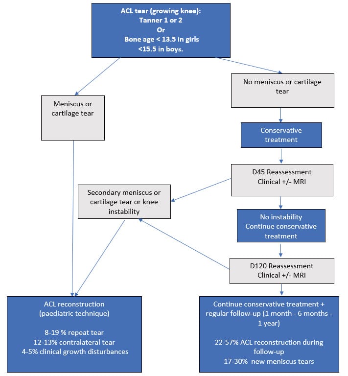 Practising sport is a key part of life in the developed world and anterior cruciate ligament (ACL) tear has become a common pathology, even in the paediatric population. In fact, ACL tears account for around 25 to 30% of knee injuries in young athletes[1],Swenson DM., Collins CL., Best TM., et al. Epidemiology of Knee Injuries among U.S. High School Athletes, 2005/2006–2010/2011. Medicine & Science in Sports & Exercise 2013;45(3):462–9. Doi: 10.1249/MSS.0b013e318277acca.[2] Shea KG., Pfeiffer R., Wang JH., et al. Anterior Cruciate Ligament Injury in Pediatric and Adolescent Soccer Players: An Analysis of Insurance Data: Journal of Pediatric Orthopaedics 2004:623–8. Doi: 10.1097/00004694-200411000-00005. . Over the past twenty years, the incidence of these injuries has risen significantly, growing by around 2.3% per year, with a peak noted in teenagers[3] Beck NA., Lawrence JTR., Nordin JD., et al. ACL Tears in School-Aged Children and Adolescents Over 20 Years. Pediatrics 2017;139(3):e20161877. Doi: 10.1542/peds.2016-1877.. This rise is based on a number of factors: an increase in the number of young people taking part in sport, specialising in a sport at an early age and the heavy burden of training and competing[4] Popkin CA., Wright ML., Pennock AT., et al. Trends in Management and Complications of Anterior Cruciate Ligament Injuries in Pediatric Patients: A Survey of the PRiSM Society. Journal of Pediatric Orthopaedics 2018;38(2):e61–5. Doi: 10.1097/BPO.0000000000001098.. The management of growing children who have an ACL tear nonetheless remains a contentious issue, both in terms of the role for conservative and surgical treatments and the timing of management. This controversy is based on two main problems: