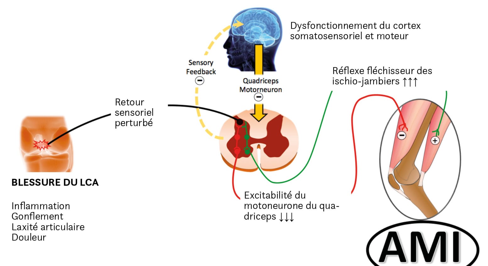 - Firstly, local factors such as inflammation, swelling, pain and the destruction of mechanoreceptors appear to lead to disrupted sensory feedback. This triggers a dysfunction of spinal reflex pathways, activating the flexor reflex (contracture of the hamstrings), Ib non-reciprocal inhibition pathways and the gamma loop. All of these factors contribute to reducing quadriceps contraction.