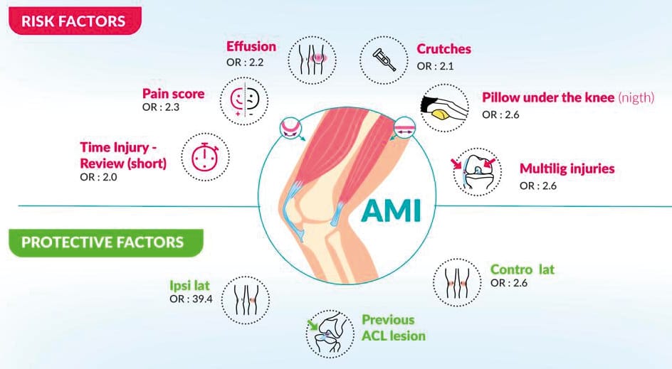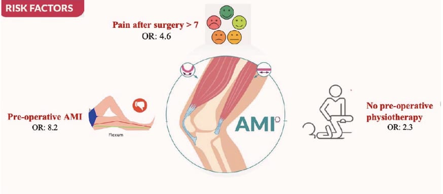 Key Points: A prospective analysis of 210 patients undergoing primary or revision ACL reconstruction was conducted. The incidence of AMI was 48.6% at three weeks postoperatively, decreasing to 24.3% at six weeks. Multivariate analysis identified three significant risk factors for AMI at the three-week interval: preoperative presence of AMI (OR 8.2), immediate postoperative pain scores exceeding 7/10 on a numerical rating scale (OR 4.6), and the absence of preoperative physiotherapy (OR 2.6). Most identified cases were classified as Grade A (clinically reversible). No significant correlations between the studied risk factors and AMI were observed at the six-week mark.