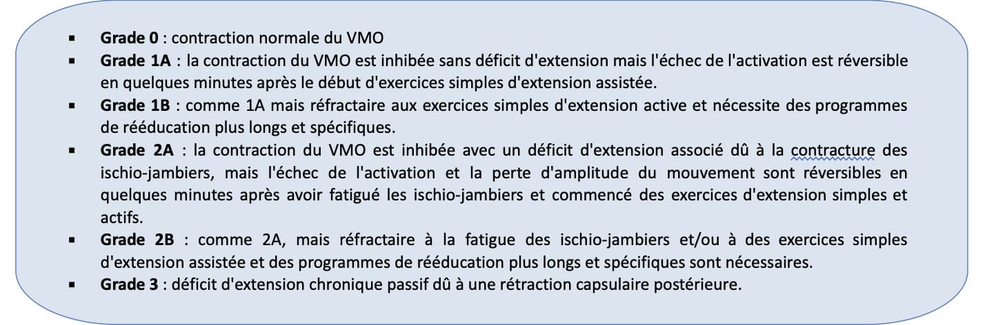 At each consultation: C0 (pre-surgery), C3 (3 weeks post-surgery) and C6 (6 weeks post-surgery), patients completed a monitoring questionnaire from the surgeons/doctors. There were three different questionnaires, one for each consultation, accessed via three QR codes that had been generated specifically for our study (Q0 at C0, Q3 at C3 and Q6 at C6). At each consultation, the AMI grade was determined by the practitioner based on the following clinical classification [6] Sonnery-Cottet B, Hopper G, Gousopoulos L, et al. Arthrogenic Muscle Inhibition Following Knee Injury or Surgery: Pathophysiology, Classification, and Treatment. Video J Sports Med. 2022;2. (Figure 4).