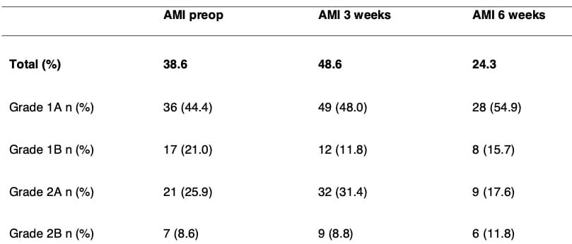In total, 210 patients were prospectively recruited between January and October 2023. Of these, 38.6 % of patients presented signs of AMI (n=81) in the post-operative period. Three weeks post-operatively, a total of 48.6% of patients (n=102) presented with a clinical picture of AMI. Of these, 64.7% already had AMI prior to surgery (p<0.001). The number of patients presenting with a clinical picture of AMI had fallen to 24.3% by 6 weeks post-surgery. Of these, 66.7% had presented with AMI prior to surgery (p<0.001). The incidence and grades of AMI observed are shown in table 1. It was also noted that in the vast majority of cases AMI was reversible (grade A).