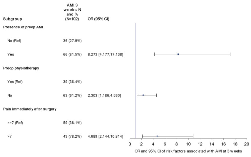 The risk factors identified in a multivariate analysis were: pain that must exceed 7/10 on the numerical rating scale immediately after surgery, pre-operative AMI and no physiotherapy pre-operatively. The odds ratios are shown in figures 5 and 6.