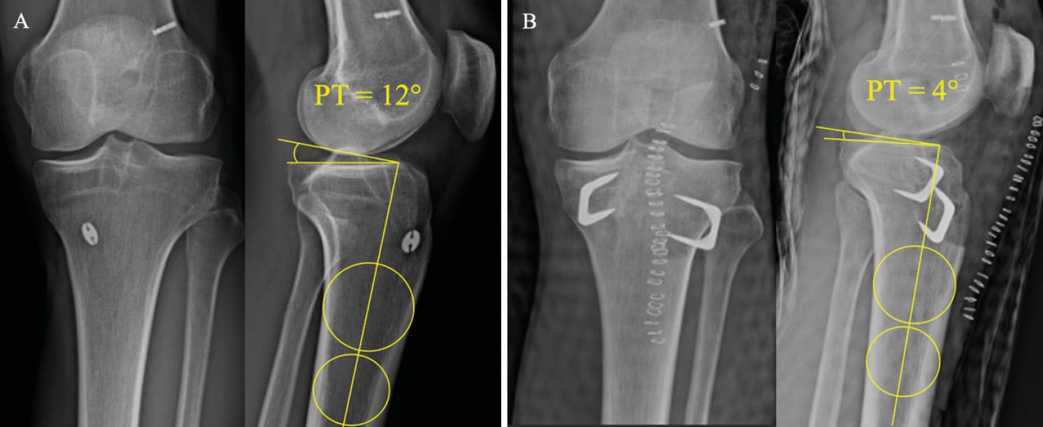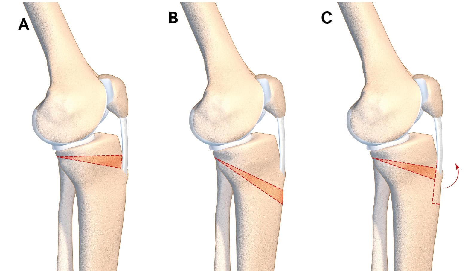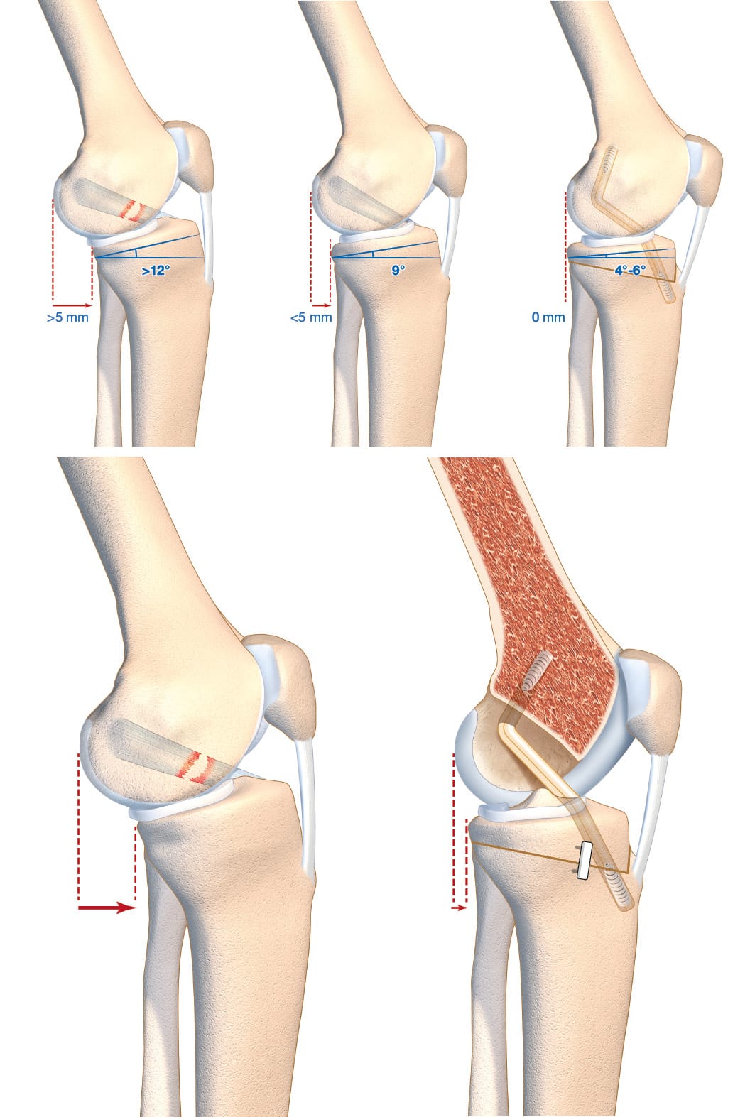 Key Points: Biomechanical data indicate that each degree of medial PTS increases anterior translation by 0.46 mm. Radiographic assessment requires true lateral views in single-leg weight-bearing to measure PTS and SATT. Surgical intervention via supra-tubercular, trans-tubercle, or infra-tubercle TDO is indicated for revision cases with PTS ≥ 12° and SATT ≥ 5 mm. The supra-tubercular technique involves a biplanar anterior closing wedge osteotomy to achieve a target PTS of 4–6°. Clinical outcomes demonstrate graft rupture rates as low as 2% following TDO, though risks include iatrogenic genu recurvatum and minor increases in patellar height.