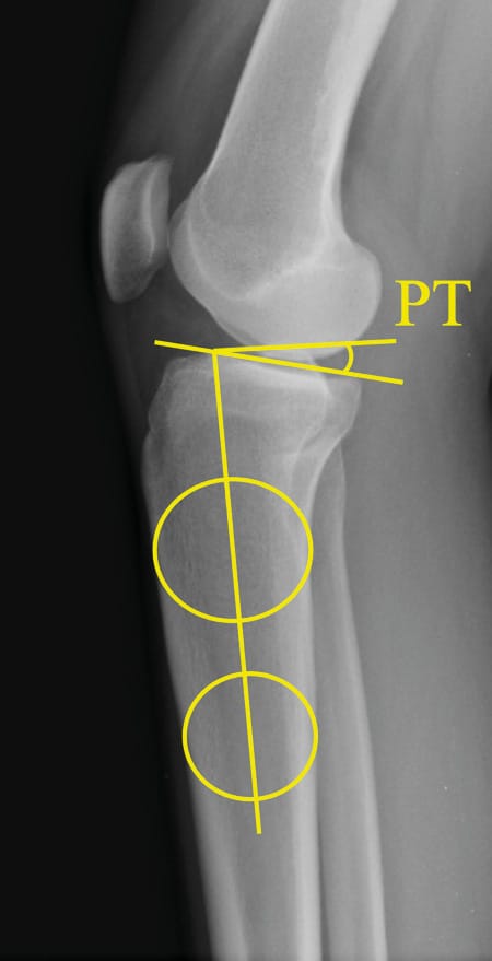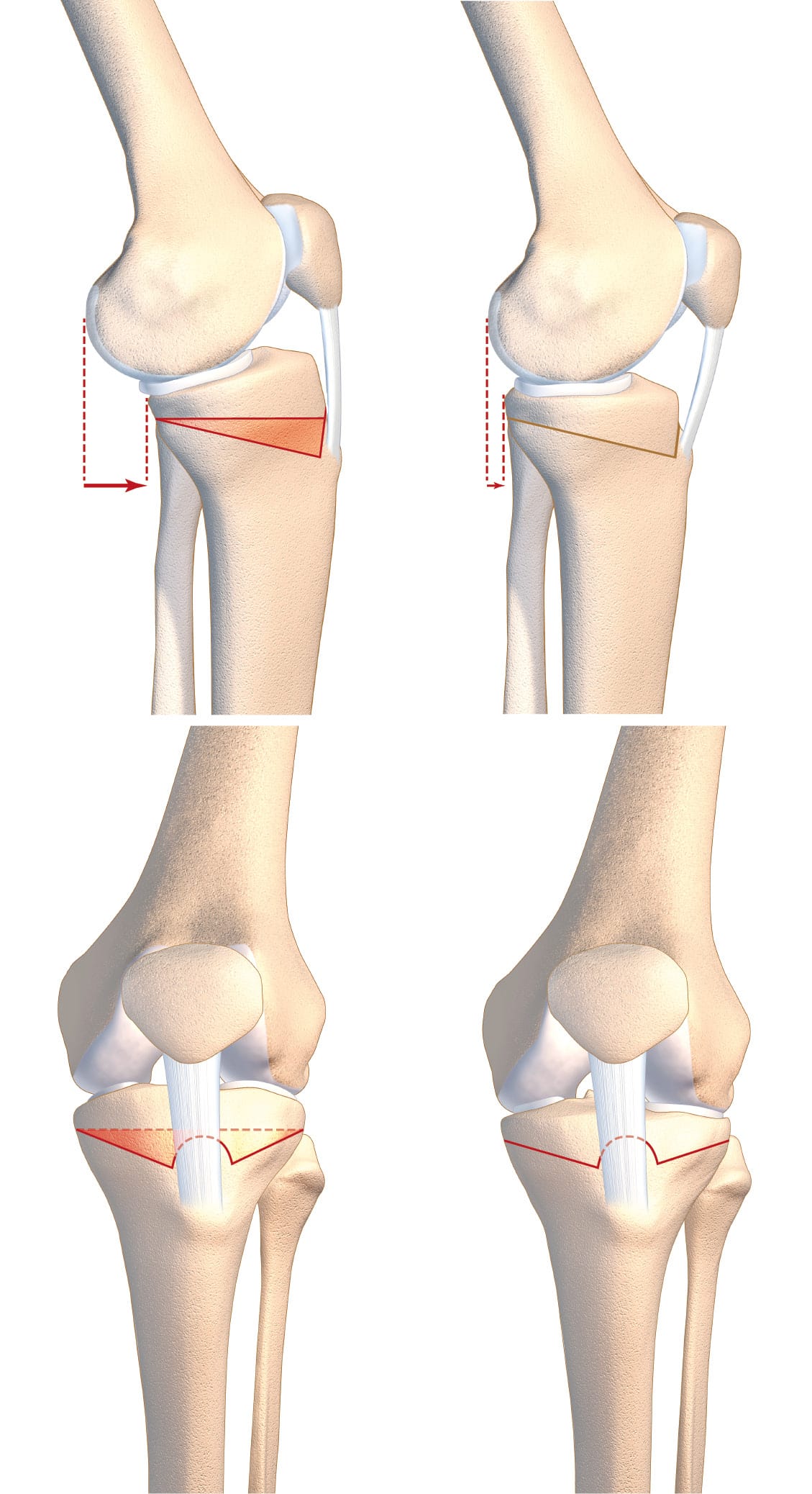 With the improvements in surgical techniques and the reduction in the rates of repeat tear due to issues of technique, other risk factors have come into the foreground. It is not only in humans that tibial slope is relevant, as this assessment is also used in the veterinary field. In fact, medium to large dogs can tear the cranial cruciate ligament (CCL), which is equivalent to the ACL in humans. These animals have a tibial slope of between 20 and 30°. The treatment offered for CCL tear is bone surgery rather than ligament surgery, consisting of a deflexion osteotomy [6] Dan MJ, Wills DJ, Crowley JD, Cance N, Romandini I, Walsh WR, et al. Anterior cruciate ligament zoobiquity: Can man’s best friend tell us we are being too cautious with the implementation of osteotomy to correct posterior tibial slope. Knee surg sports traumatol arthrosc. 2024 May;32(5):1071–6. . The link between tibial slope and CCL tear is clear in dogs and carrying out a single bone procedure delivers stability and decisive functional outcomes.