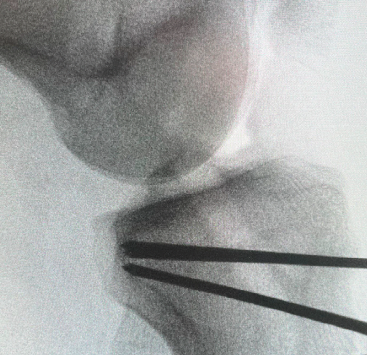 The first key step is to identify the insertion of the patellar tendon over the ATT. Then, the fascia lata and tibialis anterior muscle are released following the Keblish lateral approach. The deep medial collateral ligament is released medially. It is then possible to position double-curved retractors on both sides of the tibial metaphysis. Two proximal K-wires (diameter 2.5mm) are inserted at the patellar tendon insertion, positioned 1 cm away on both sides. Next, the two distal K-wires are inserted as planned pre-operatively, with the goal being to achieve a final tibial slope of 4-6° [7] Dan MJ, Cance N, Pineda T, Demey G, Dejour DH. 4-6 degrees is the Target Posterior Tibial Slope post Tibial Deflection Osteotomy according to the Knee Static Anterior Tibial Translation. Arthroscopy. 2023 Jul 19; . The wires must converge at the posterior cortex, 1 cm below the tibial plateau (Figure 6). The osteotomy is performed using an oscillating saw, using the proximal wires as guides inferiorly and the distal wires superiorly. In order to weaken the hinge without entirely breaking it apart, it is best to gently butt up against the posterior cortex, as if “knocking on the door”. The biplanar osteotomy is then performed just behind the patellar tendon. The bone wedge can be removed. The hinge is tested by lowering the proximal part over the distal part. Reduction is applied by gently extending the lower limb. A staple 2 cm lateral to the patellar tendon is used for temporary fixation, and the slope is checked using fluoroscopy. If the result is satisfactory, it is also fixed medially with a staple. Once the osteotomy is reduced, the tibial tunnel will be slightly angulated and it will need to be drilled again. This is done by pushing the drill bit by hand to avoid applying excessive stress on the osteotomy line. The graft can then be passed through and fixed in place. Fixation is performed in 70° of flexion to avoid any genu recurvatum.