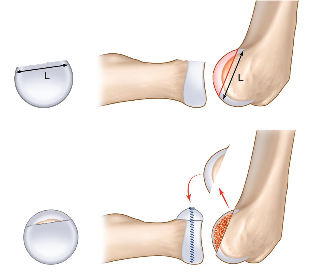 In an MRI study of 83 patients, Griswold et al. measured the diameters of the radial head and capitellum, finding them to be identical [19] Griswold BG, Steflik MJ, Adams BG, Hebert-Davies J, Tokish JM, Parada SA, Galvin JW. Radius of curvature of the radial head matches the capitellum: a magnetic resonance imaging analysis. JSES Int. 2023 Mar 12;7(4):668-672. doi: 10.1016/j.jseint.2023.02.009.; they concluded that the radial head could be a feasible site for local osteochondral autograft where there is an osteochondral defect of capitellum, with the graft being harvested from the “safe zone” of the peripheral cartilaginous rim of the radial head, which would minimise the morbidity seen with the current practice of harvesting from the knee.