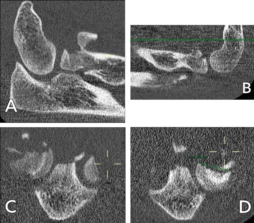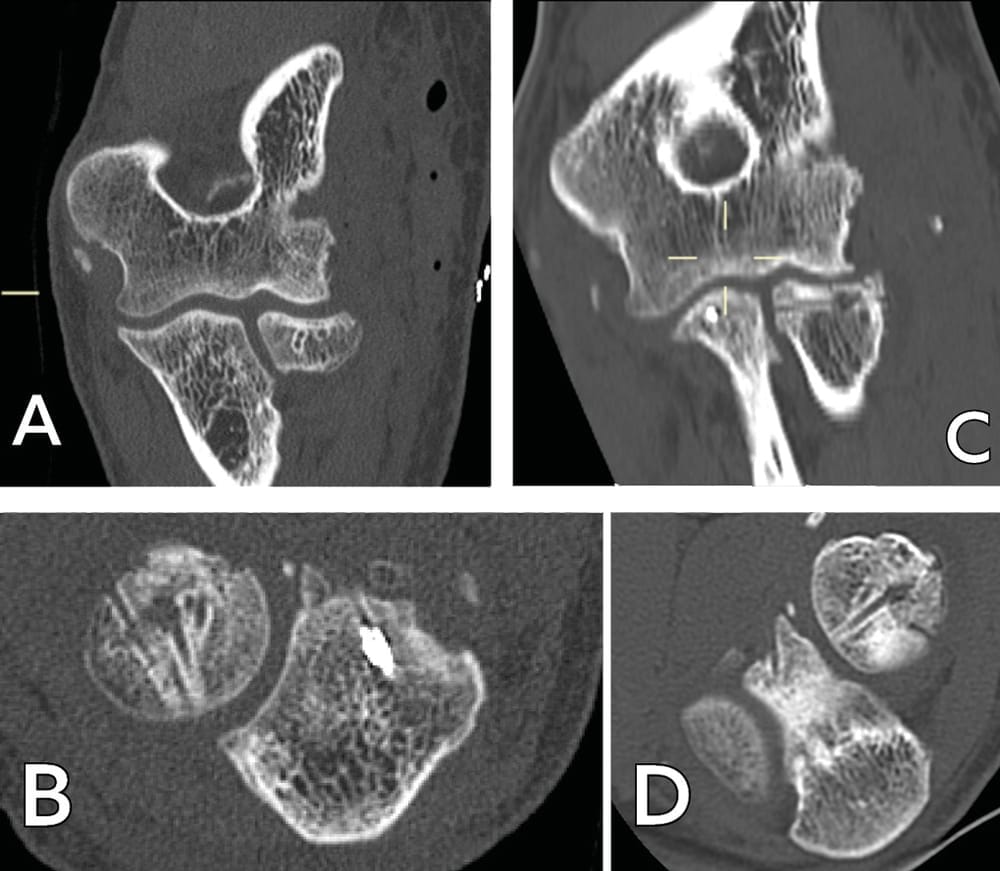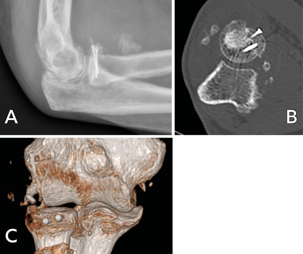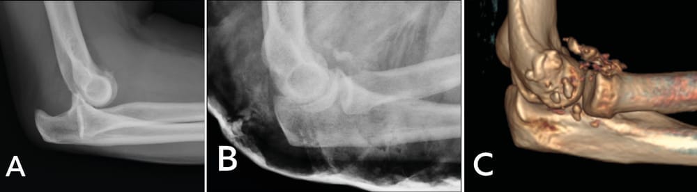 Case study 1: A 49-year-old right-handed male electrician fell from a stepladder, which led to bilateral elbow fracture dislocation (Mason 4). An emergency closed reduction was performed. Subluxation of the left elbow persisted, with damage to the ulnar nerve. After CT investigation (Figure 3), ORIF appeared to be possible, a more viable option since a prosthetic radial head would not be available for at least 5 days.