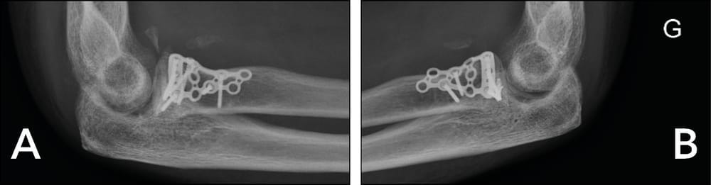 ORIF of the radial head seems to be accessible from the left side. After exposure, reconstruction proves not to be possible. A capitellum graft is harvested and fracture repair is achieved through a Medartis plate (Figure 4).