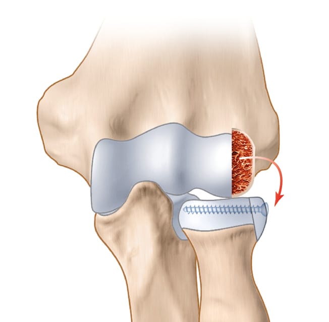 The radial head plays a role in elbow mobility and stability [4] Morrey BF, Tanaka S, An KN. Valgus stability of the elbow. A definition of primary and secondary constraints. Clin Orthop Relat Res. 1991 Apr;(265):187–95. . This means that it is crucial to preserve it if is fractured, and this is all the more important when there is ligament damage, even if the fracture is barely displaced [5], Van Riet RP, Morrey BF, O’Driscoll SW, Van Glabbeek F. Associated injuries complicating radial head fractures: A demographic study. Clin Orthop Relat Res. 2005;(441):351–5. [6] Roger P. van Riet MD, PhD, Bernard F. Morrey MD . Documentation of Associated Injuries Occurring With Radial Head Fracture. Clin Orthop Relat Res (2008) 466:130–134 doi 10.1007/s11999-007-0064-8 . If the radial head cannot be repaired by ORIF, there are currently two treatment options that are discussed: excision or replacement with an implant. While prosthetic implants have made huge strides since the 1960s, their current availability presents a new problem in the management of these fractures and leads us to propose a new therapeutic alternative: using a graft from the capitellum (lateral humeral condyle) to reconstruct the radial head, as this can re-establish the joint profile and stability of the elbow in the acute management of these traumatic injuries.