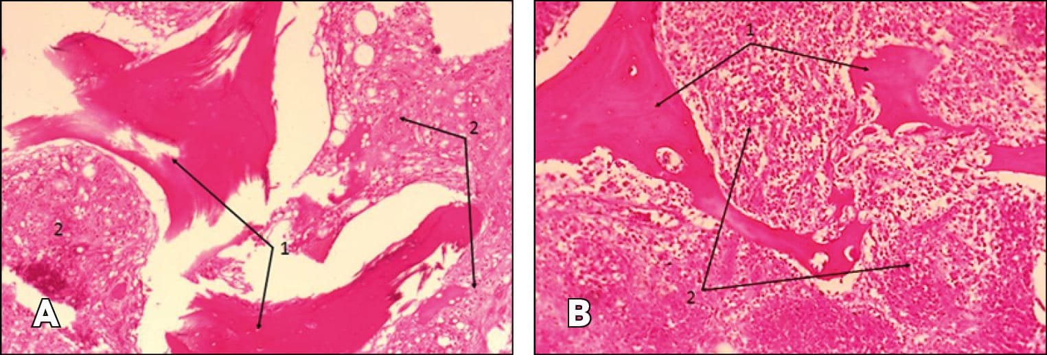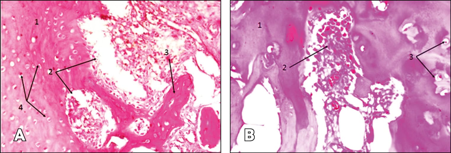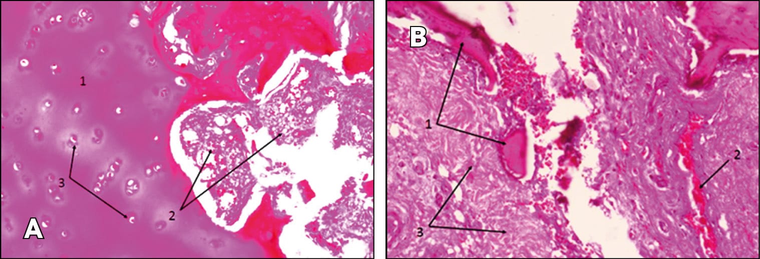 Destructive changes are more noticeable in osteoarthrosis. In the case of SOA, cartilage tissue samples show proliferation with foci of destruction (Figure 6 A). The same foci of destruction are evident against the background of normal cartilage tissue (Figure 7 B). In bone tissue samples, sequestra surrounded by a large number of neutrophils and leukocytes are noted, along with lymphoplasmacytic infiltration (Figure 5 A).