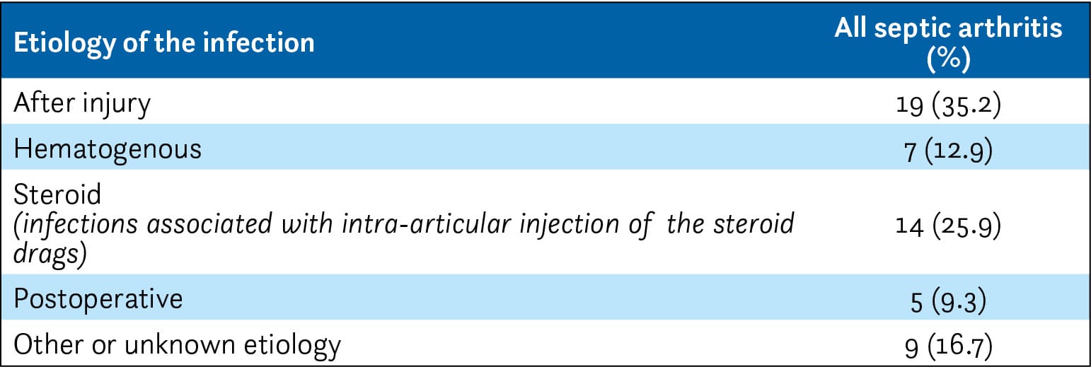 The patients were divided into two groups based on septic and steroid etiology (following steroid administration into the joint), and each group was further divided into two subgroups: arthritis (without bone tissue involvement) and osteoarthritis (with bone tissue involvement according to radiological examinations). The results of both groups were compared. All patients were treated at a clinic in Baku, Azerbaijan. According to etiological factors, the patients were distributed as follows (see Table 1).
