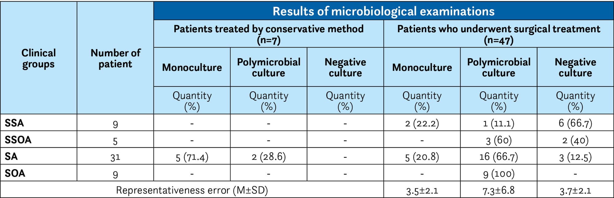 When analyzing the data of microbiological analyses in patients with SOA and SSOA, it can be noticed that associations of microorganisms are observed in them. This indicator was 100% in patients with SOA and 60% in patients with SSOA. It can be assumed that the chronization of the septic process contributes to this. As for the large number of negative results in microbiological analyses in patients with SSA and SSOA, it is definitely challenging to answer these interesting data. Here, data from Á J Geirsson et al. (2008) can be cited, which noted that 39% of children with a clinical picture of septic arthritis had negative results in synovial fluid and blood cultures. Clinical and laboratory characteristics were similar in children with positive and negative cultures [17] Geirsson AJ, Statkevicius S, Víkingsson A. Septic arthritis in Iceland 1990-2002: increasing incidence due to iatrogenic infections. Ann Rheum Dis. 2008;67(5):638–643. doi: 10.1136/ard.2007.077131. . The authors note that the results are identical to numerous other reports, and to date, no reasonable explanation has been proposed [32], Yagupsky P, Bar-Ziv Y, Howard CB, Dagan R. Epidemiology, etiology and clinical features of septic arthritis in children younger that 24 months. Arch Pediatr Adolesc Med 1995;149:537–40 [33], Wang CL, Wang SM, Yang YJ, Tsai CH, Liu CC. Septic arthritis in children: relationship of causative pathogens, complications and outcome. J Microbiol Immunol Infect 2003;36:41–6 [34], Goergens ED, McEvoy A, Watson M, Barrett IR. Acute osteomyelitis and septic arthritis in children. J Pediatr Child Health 2005;41:59–62 [35], Peltola H, Vahvanen V. Acute purulent arthritis in children. Scand J Infect Dis. 1983;15(1):75-80. doi: 10.3109/inf.1983.15.issue-1.12. PMID: 6844880.[36] Kunnamo I, Kallio P, Pelkonen P. Incidence of arthritis in urban Finnish children. A prospective study. Arthr Rheum 1986;29:1232–8 .