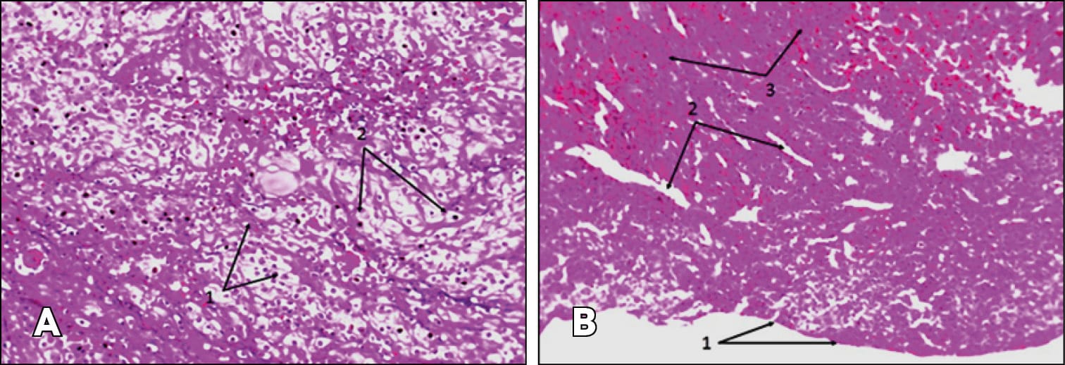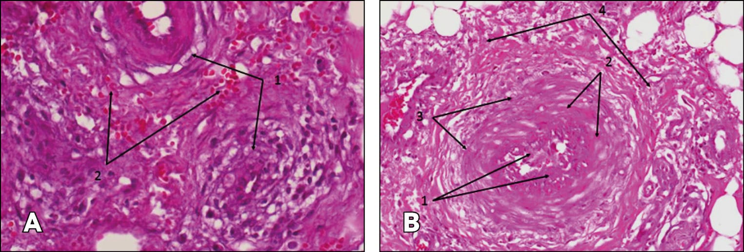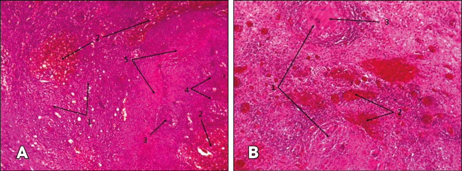 The analysis of histological sections yielded the following results: Paralytic dilated sinusoidal capillaries, intravascular stasis, and vascular edema were observed in all histological samples. In arthritis of steroid etiology, a large amount of lymphoplasmacytic and neutrophil infiltrate around sinusoidal-type vessels is observed (Figure. 2 B), eosinophilic leukocytes (Figure 4 A), necrotic granulomatous foci of inflammation, areas of hemorrhage, and giant multinucleated macrophages (Figure 1 B). During an acute inflammatory reaction, a large number of neutrophils, leukocytes, individual lymphocytes, and plasma cells were observed (Figure 2 A). In SA, multiple lymphoplasmacytic infiltrations, fibrosclerotic changes, multinucleated giant cells - Langhans-type cells, and granulomatous foci of inflammation accompanied by areas of hemorrhage were observed (Figure 1 A).