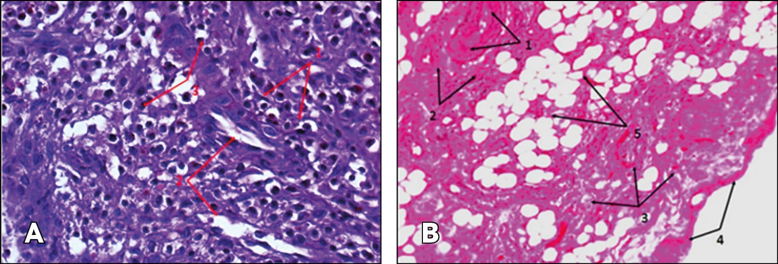 In SOA, we observe vessel wall destruction, lymphoplasmacytic infiltration, vascular fibrosclerotic changes, signs of hyperemia (numerous capillaries), fibrosis of adipose tissue, formation of bone sequestra, and multiple neutrophils and leukocytes (Figures 4 B, 5 A).