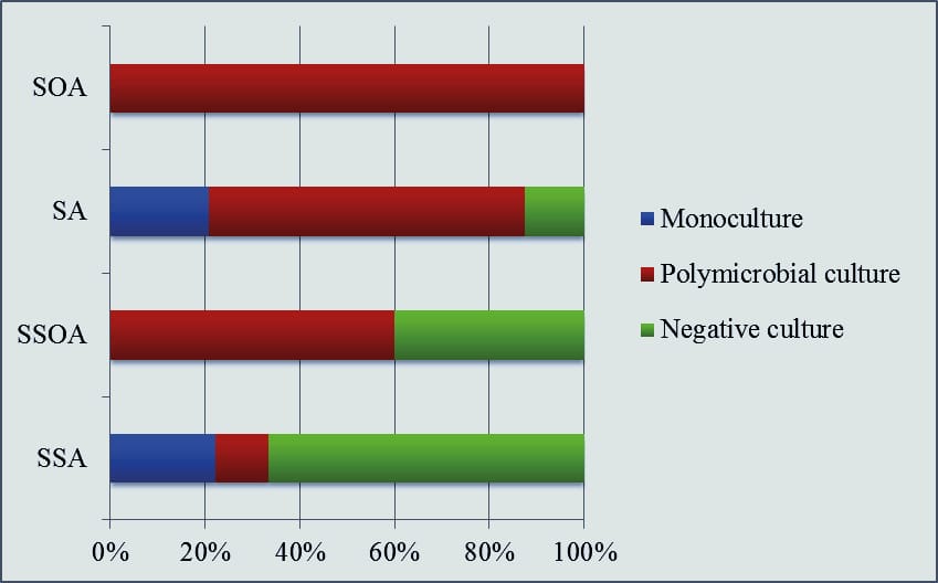 In patients with septic arthritis (SA), positive cultures were identified in 90.3% of patients. 100% of patients with septic osteoarthritis (SOA) had positive cultures, exclusively in the form of mixed flora. In patients with steroid-induced septic arthritis (SSA), cultures were positive in 33.3% of patients. Positive cultures were found in 60% of patients with steroid-induced septic osteoarthritis (SSOA) (Table 3).