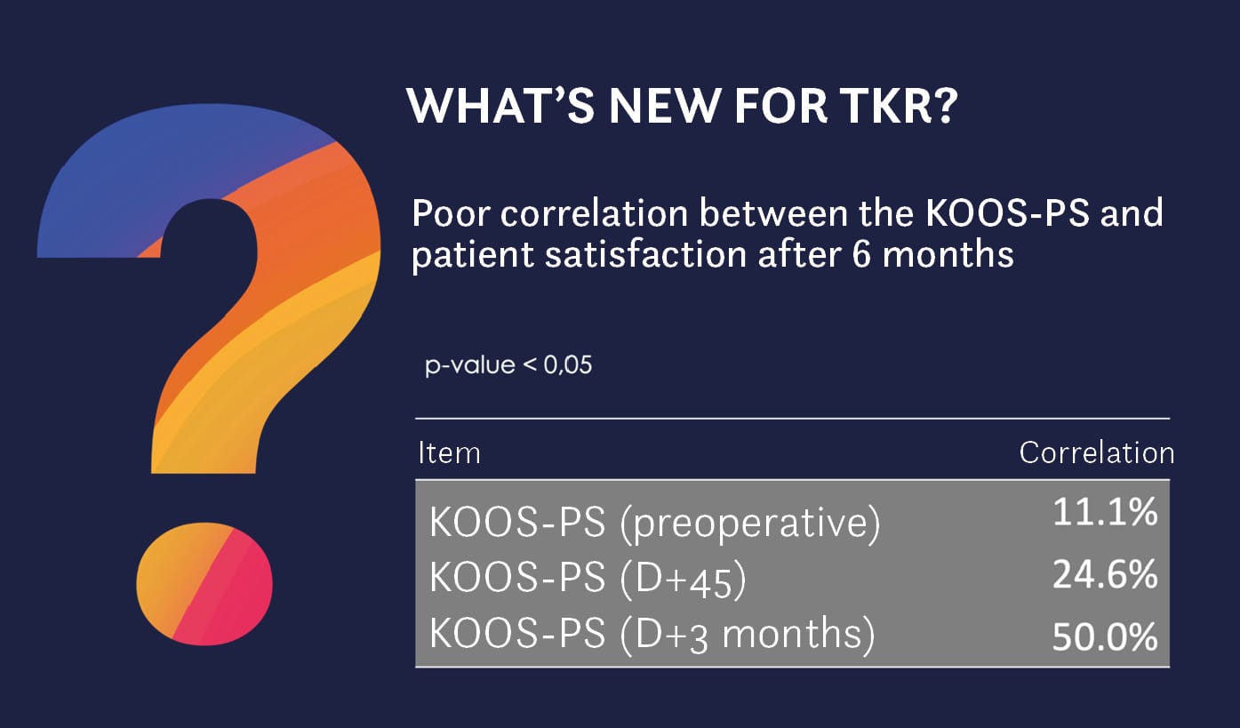 A high score on the KOOS, which has for a long time been considered to be a criterion for judging a knee arthroplasty result as good, and it still is, turns out to be very poorly correlated with overall patient satisfaction. Should we still use it? Is it time to update it? (Figure 2).