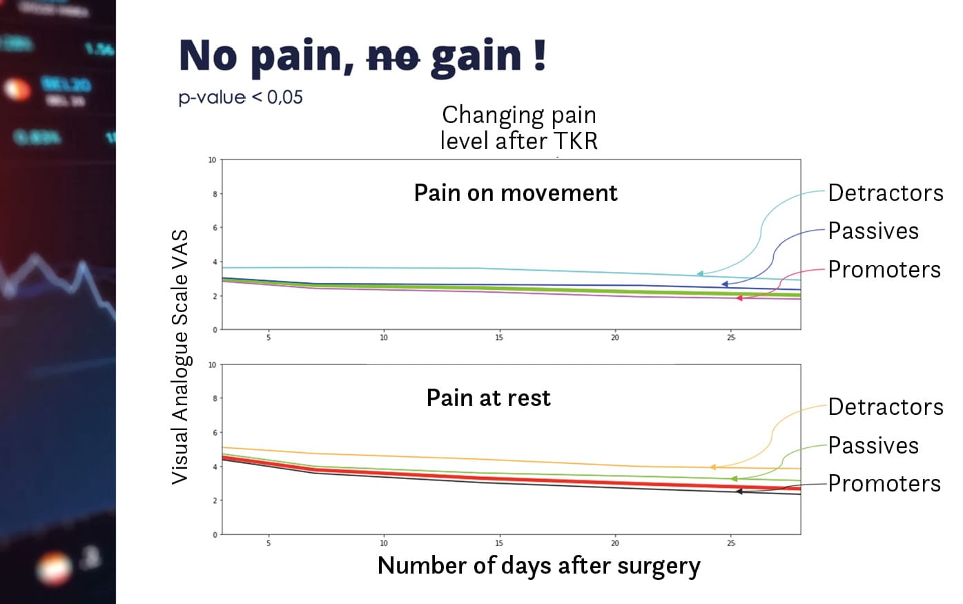 Apply-ing the Net Promoter Score (NPS), the detractors, or least satisfied group, whether thinking about their experience during movement or at rest, rated their satisfaction between 0 and 6 on a scale of 0 to 10, and felt greater postoperative pain than the promoters (scores of 9 and 10) (Figure 3).