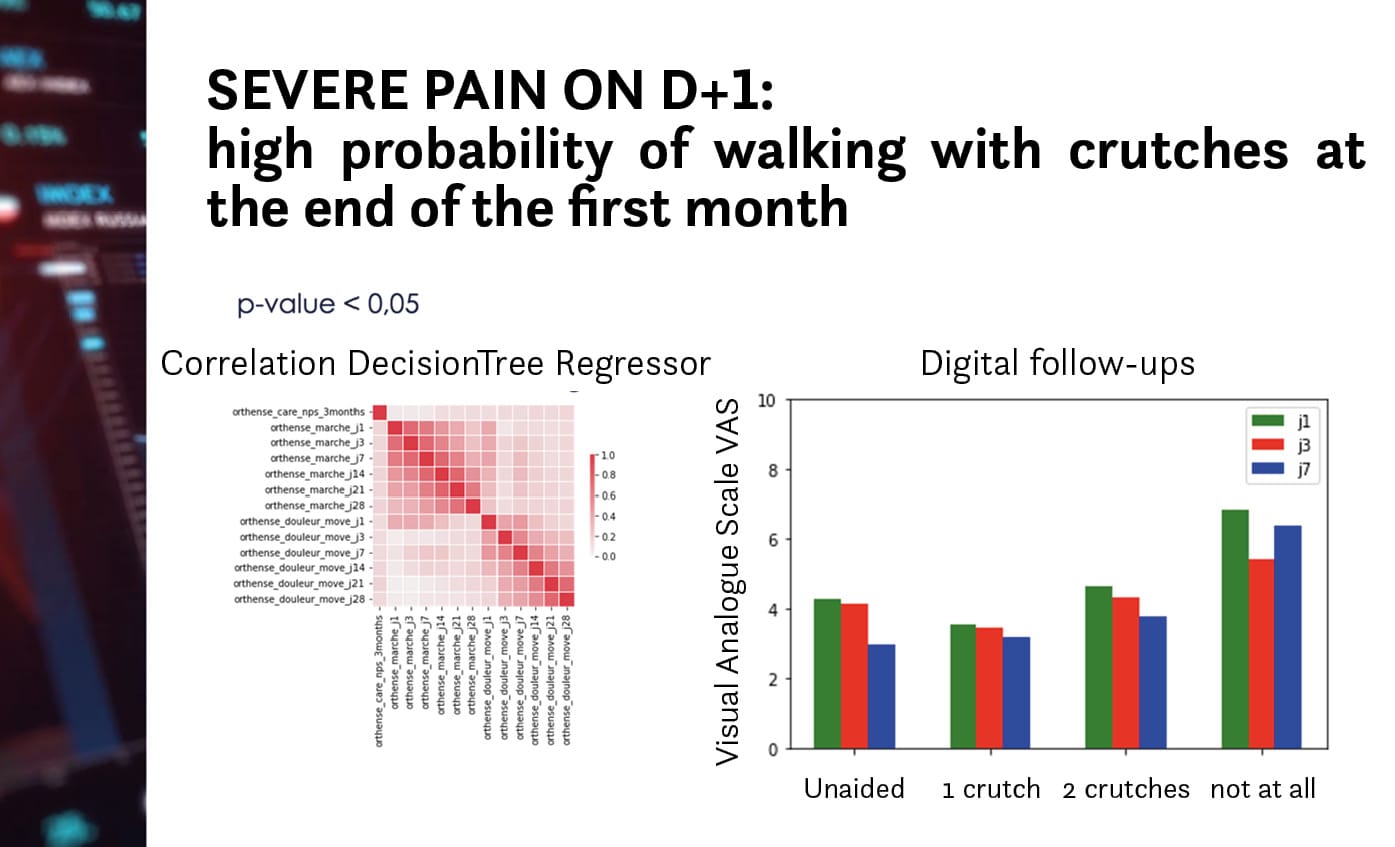 The diagram on correlation is somewhat difficult to understand, but it shows that being in significant pain on D+1 post-surgery has the almost unavoidable effect that the patient will be walking with crutches 1 month after surgery (Figure 4). This finding is perhaps less intuitive.