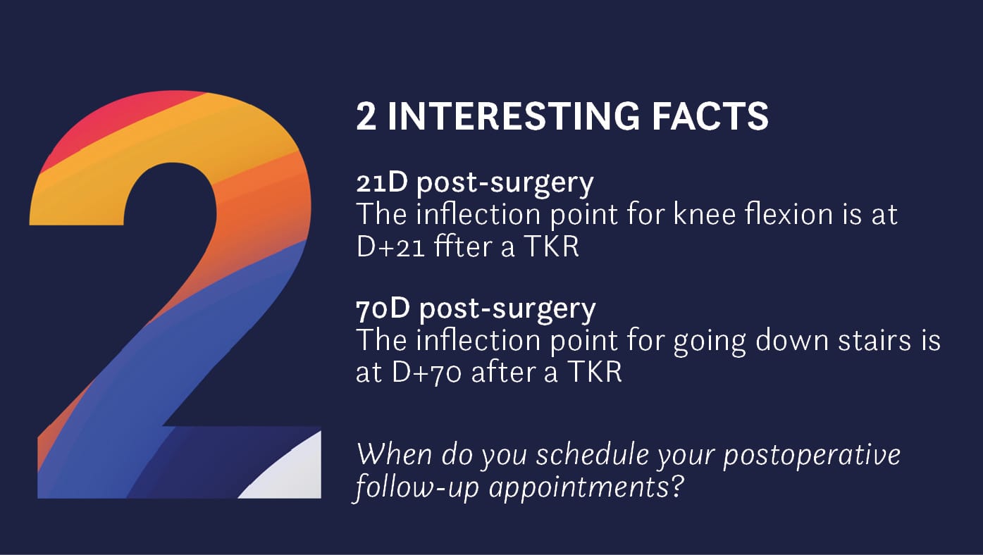 Analysing a lot of data gives us the basis to demonstrate whether, after TKR, flexion that does not exceed 90° by D+21 will improve any further. If it won’t, waiting is pointless if we want to perform manipulation under general anaesthesia. I always used to see my patients for a first postoperative appointment 6 weeks after surgery. Now I see them after 3 weeks.