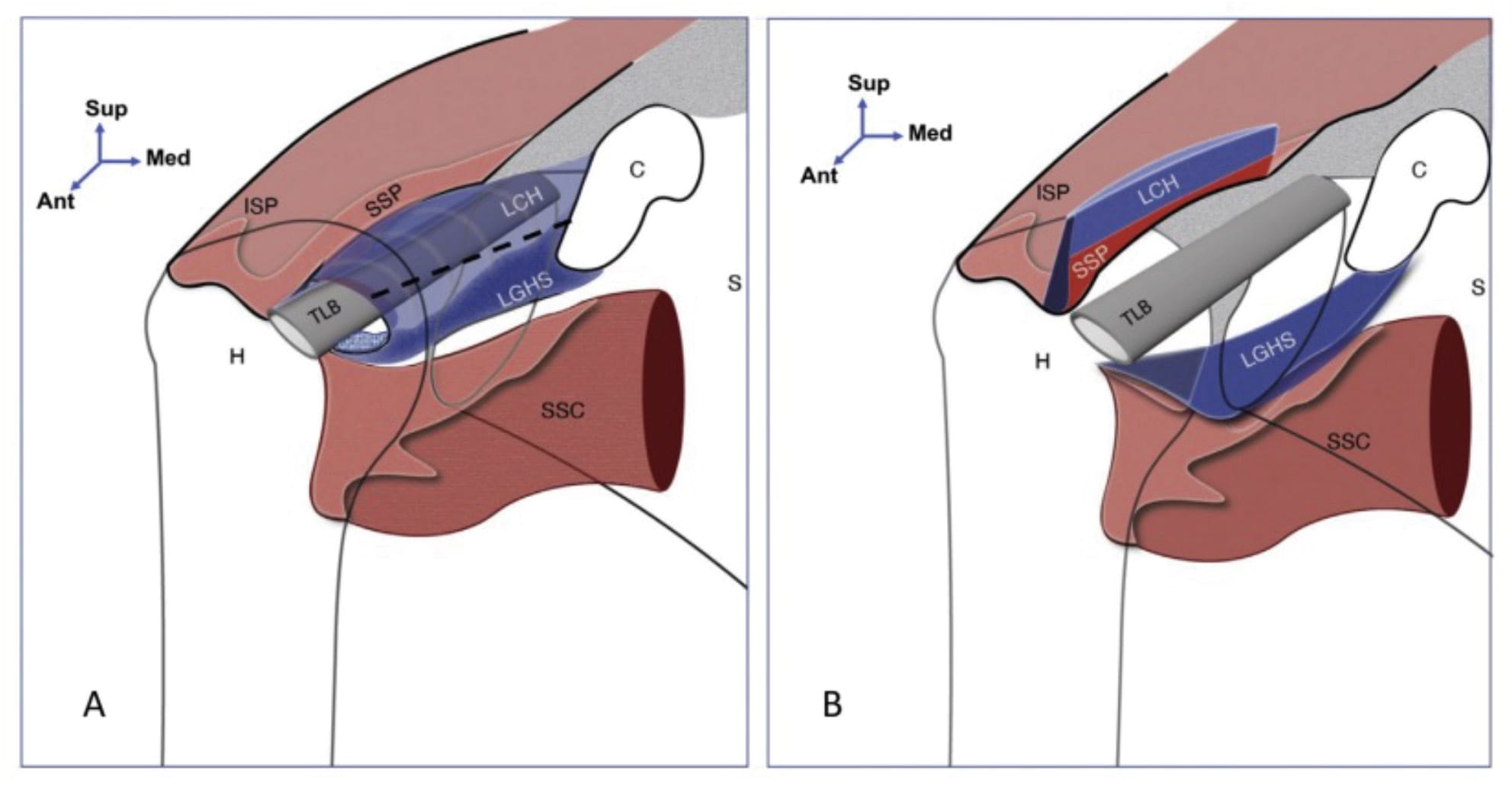 A classic topographical presentation in shoulder pain is projection towards the front [1], Ahrens PM, Boileau P. The long head of biceps and associated tendinopathy. J Bone Joint Surg Br. 2007;89(8):1001-1009. doi:10.1302/0301-620X.89B8.19278[2] Neviaser RJ. Lesions of the biceps and tendinitis of the shoulder. Orthop Clin North Am. 1980;11(2):343-348.. The nosological origin is not well established although it is recognised that the intra-articular portion of the biceps (the long head of biceps tendon, LHBT) is one possible explanation [3] Virk MS, Cole BJ. Proximal Biceps Tendon and Rotator Cuff Tears. Clin Sports Med. 2016;35(1):153-161. doi:10.1016/j.csm.2015.08.010. In line with this hypothesis, routinely sacrificing the LHBT in arthroscopic rotator cuff repairs or shoulder arthroplasty would seem to be justified [4] Walch G, Edwards TB, Boulahia A, Nové-Josserand L, Neyton L, Szabo I. Arthroscopic tenotomy of the long head of the biceps in the treatment of rotator cuff tears: clinical and radiographic results of 307 cases. J Shoulder Elbow Surg. 2005;14(3):238-246. doi:10.1016/j.jse.2004.07.008. The “biceps killer” approach is very widespread in France, yet it is not the consensus worldwide [5] Vigié R, Bonnevialle N, Hao KA, Berhouet J, Charousset C, Francophone Arthroscopy Society (SFA). Tenotomy or tenodesis versus conservation of the long head of the biceps tendon in the repair of isolated supraspinatus tears: A systematic review of the literature. Orthop Traumatol Surg Res. Published online August 30, 2023:103673. doi:10.1016/j.otsr.2023.103673, mainly because of complications like the Popeye sign after tenotomy ± tenodesis of the LHBT [6] Pouliquen L, Berhouet J, Istvan M, Thomazeau H, Ropars M, Collin P. Popeye sign: Frequency and functional impact. Orthop Traumatol Surg Res. 2018;104(6):817-822. doi:10.1016/j.otsr.2018.02.016. Some authors have suggested the possibility of anterosuperior impingement that could be due to involvement of structures around the LHBT, in particular the biceps pulley, which would remove suspicion from LHBT itself as the cause [7] Gerber C, Sebesta A. Impingement of the deep surface of the subscapularis tendon and the reflection pulley on the anterosuperior glenoid rim: a preliminary report. J Shoulder Elbow Surg. 2000;9(6):483-490. doi:10.1067/mse.2000.109322.