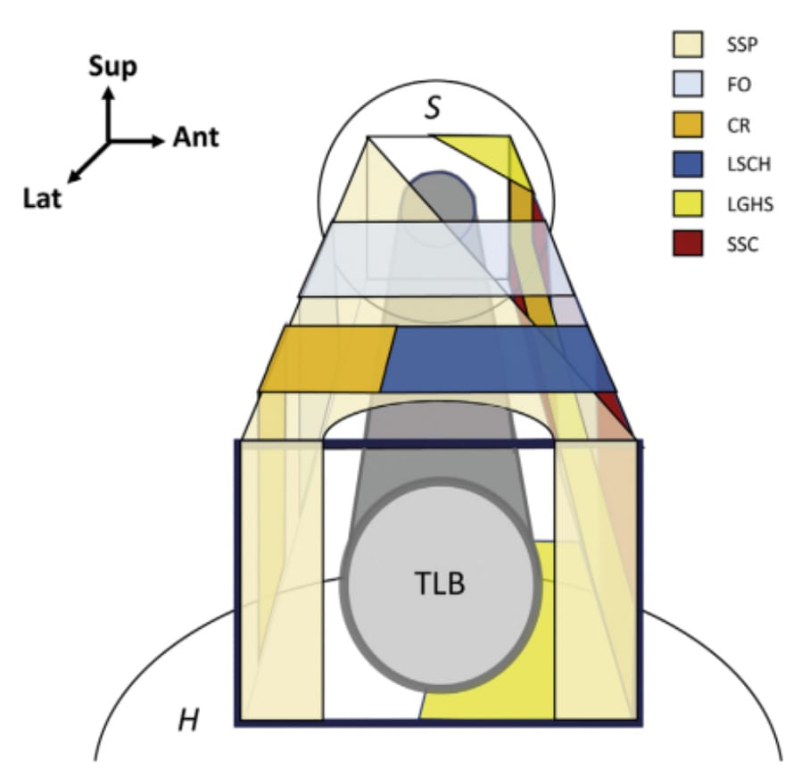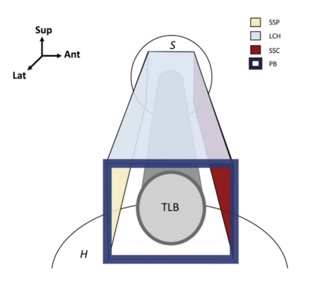 The intra-articular portion of the biceps is located within the rotator interval, forming the centre within the other structures that appear to wrap around it [13], Jost B, Koch PP, Gerber C. Anatomy and functional aspects of the rotator interval. J Shoulder Elbow Surg. 2000;9(4):336-341. doi:10.1067/mse.2000.106746[14] Zappia M, Reginelli A, Russo A, et al. Long head of the biceps tendon and rotator interval. Musculoskelet Surg. 2013;97 Suppl 2:S99-108. doi:10.1007/s12306-013-0290-z. Figure 1 presents the anatomical view of where the LHBT is located within the rotator interval with the supraspinatus tendon (SSP) behind and the subscapularis tendon (SSC) in front, the coracohumeral ligament (CHL) and the superior glenohumeral ligament (SGHL) above and the humeral head cartilage below, the glenoid and superior labrum inside and the biceps outside. Although the surfaces are not flat, it seemed to us to be possible to look at this anatomical region through a functional geometric model with a cuboid shape called the “biceps box” [11] Gadéa F, Dordain F, Merbah J, Charousset C, Berhouet J, Francophone Arthroscopy Society (SFA). Methods to analyse the long head of the biceps in the management of distal ruptures of the supraspinatus tendon. Part 1: the concept of the “biceps box”: dynamic rotator interval approach. Incidence of lesions of the long head of the biceps tendon. Orthop Traumatol Surg Res. Published online July 28, 2023:103669. doi:10.1016/j.otsr.2023.103669. Figure 2 presents the modelling of the “biceps box”.