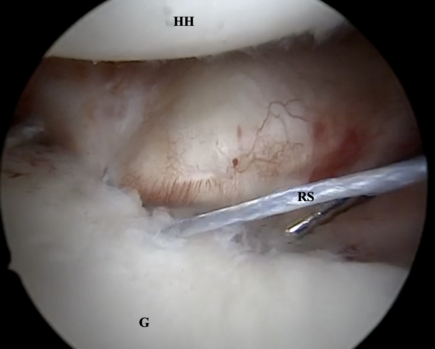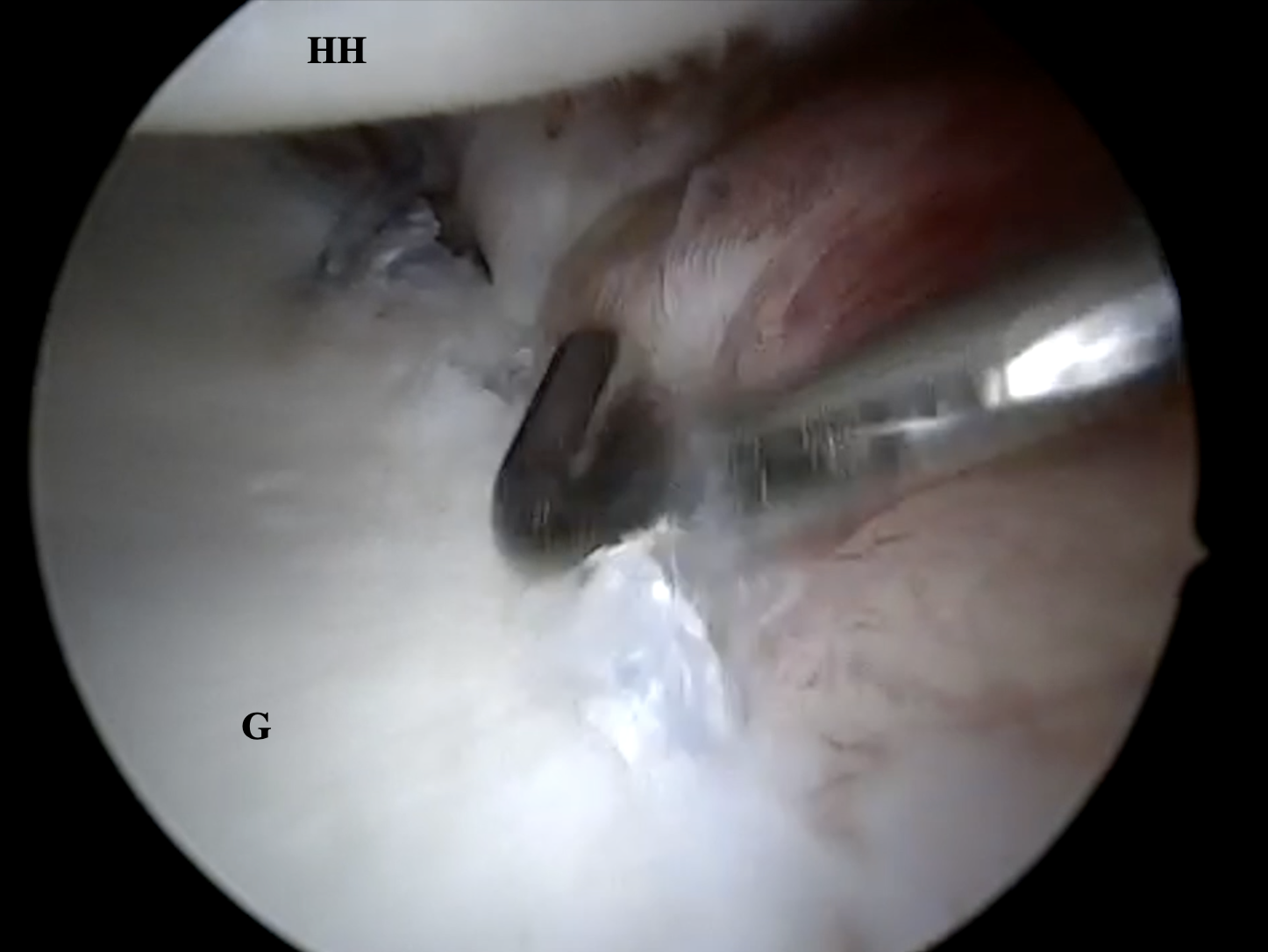 First, a standard posterior viewing portal is established parallel to the joint line. During a standard diagnostic arthroscopy labral configuration, capsular volume, and concomitant pathologies are documented. Special attention is given to the assessment of the Hill-Sachs lesion. An anteroinferior portal at the lateral upper edge of the subscapularis tendon is established. A cannula (Twist-In, Arthrex Inc., Naples, FL) is placed in the anteroinferior portal. Then an anterosuperior viewing portal is established in the rotator interval and posterior to the long head of the biceps tendon. Under visualization via the anterosuperior portal, a cannula (Gemini, Arthrex Inc., Naples, FL) is positioned in the posterior portal.