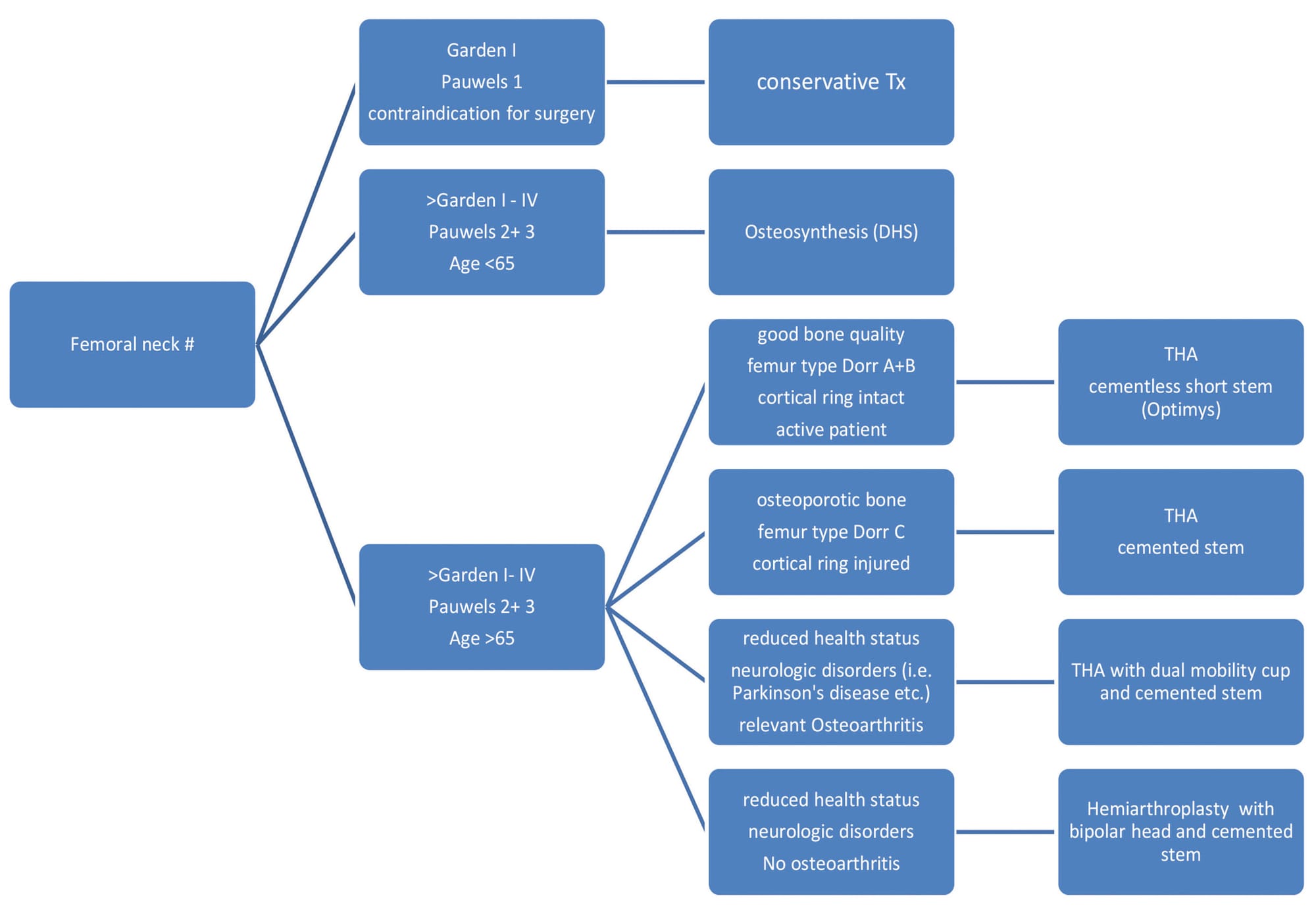 Objective: This article describes the "Wiesbaden concept," a standardized treatment algorithm for femoral neck fractures designed to optimize implant selection based on patient demographics, bone quality, and functional requirements.