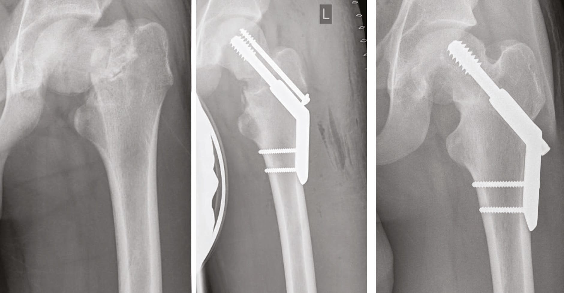 Conservative treatment remains an option, but only a small number of patients are eligible. Secondary dislocation can occur in up to 50% (Figure 3). In younger patients (<65 years) osteosynthesis with a DHS is our preferred method (Figure 2). In patients >65 years we prefer joint replacement even in undisplaced fractures (Garden I + II). Therefore the majority of our cases is treated with joint replacement procedures (Table 1.).