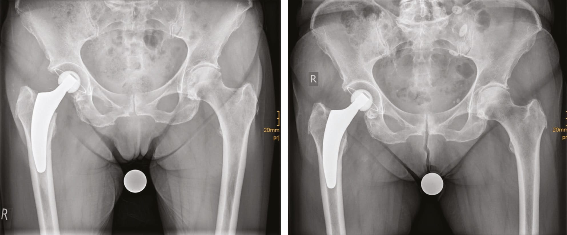 Hemiarthroplasty (HA) with 37% is still widely used. However, 57% of our patients obtain a THA. Cemented fixation is necessary in most cases due to bone quality, intraoperative cortical ring structure or known osteoporosis in the patient history. In active patients with good bone quality, femoral Dorr type A or B, intact cortical ring cementless fixation is possible. If cementless fixation is considered short stem fixation is possible and our favoured method. Straight cementless stems are rarely used. Our clinical and radiographic results using cementless short stems so far are very promising (Figure 4). Clinical results in these selected cases are excellent and complication rates are low. Currently a clinical and radiographic study is under process and will be finished by 2019.