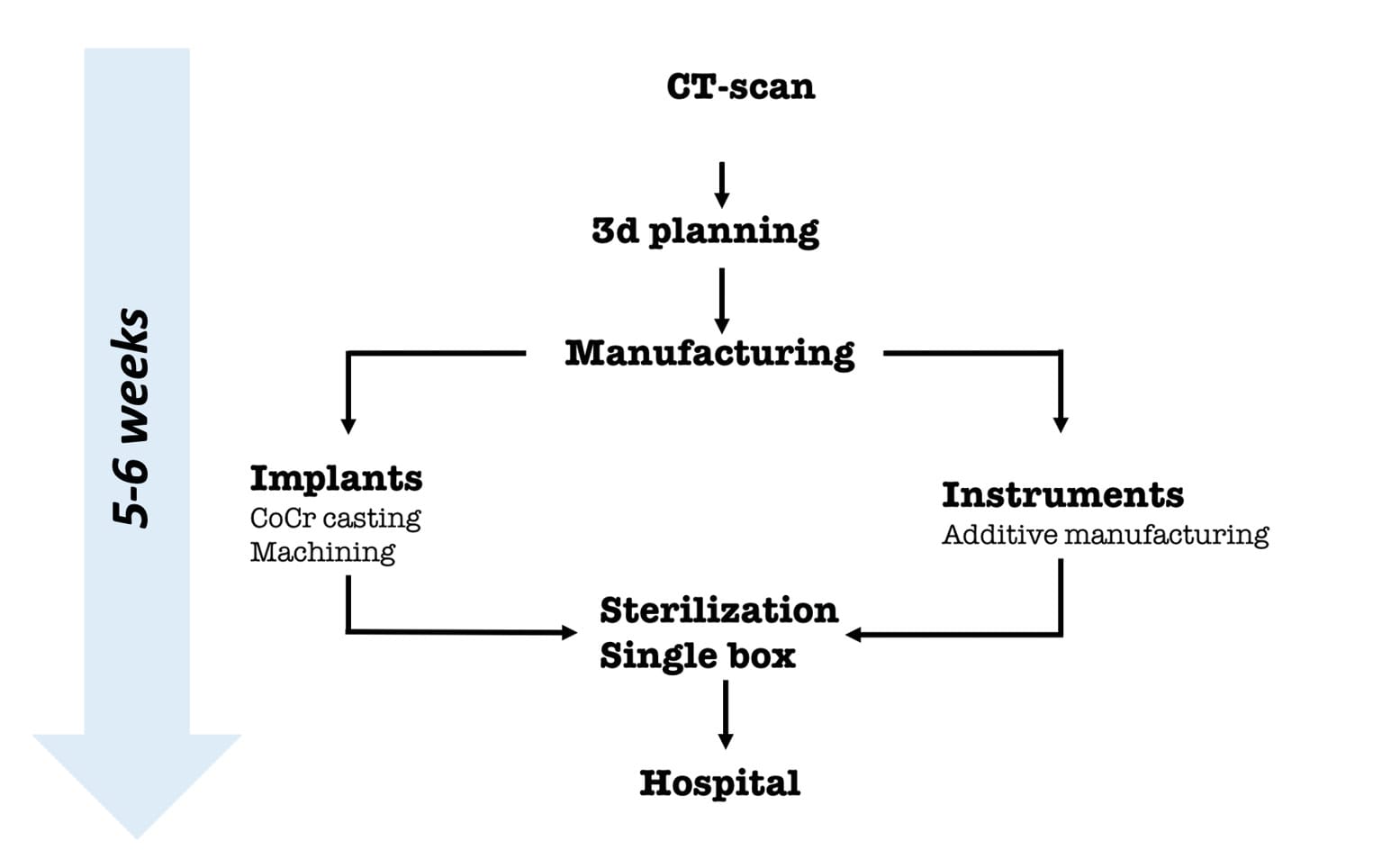 The design and manufacturing process of the Origin TKA takes five to six weeks and requires cooperation between surgeons and engineers. The design is based on 3D CT analysis of bony anatomy, arthritic deformities, and limb alignment, based on a specific radiographic protocol, including the knee, hip, and ankle joints. The DICOM files are collected and sent electronically to the engineering team through a secured ‘Symbios box’. A 3D analysis is performed with the Knee-Plan® software (Symbios, Yverdon-les-Bains, Switzerland). This process integrates 3D planning and the manufacturing of implants adapted to a specific alignment. A set of patient-specific instruments (PSI) manufactured with additive technology provides accurate adjustment of the bone cuts (Figure 2).