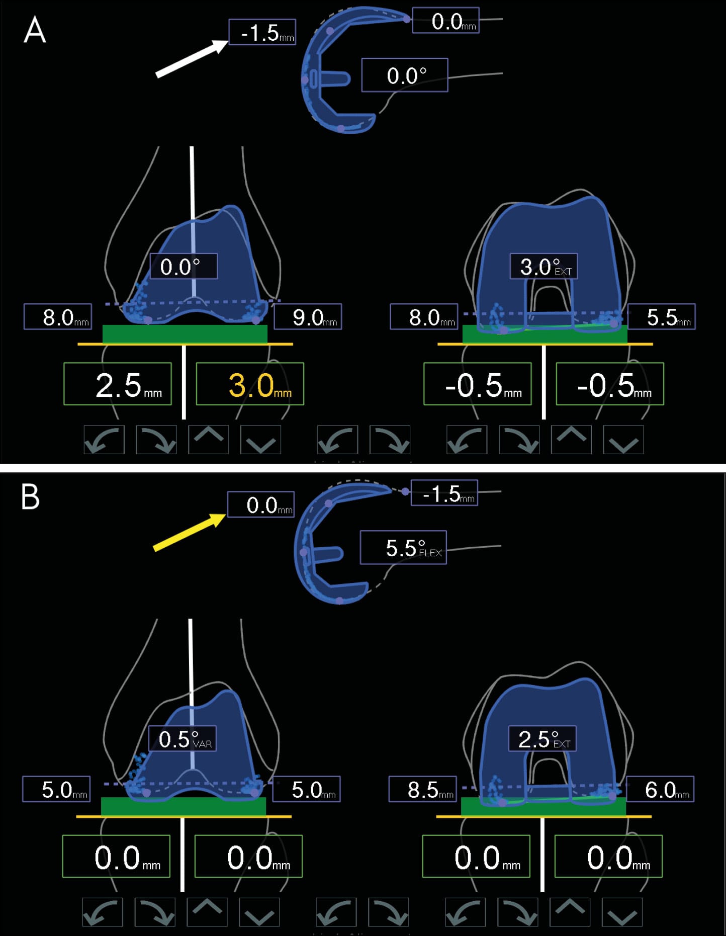 During planning, the use of this reference, in combination with joint spaces, implant size, notching and condylar shapes, was used to optimize implant positioning according to surgeon experience. In figure 3 an example is shown. On left side (Figure 3A) default implant position is proposed by navigation system, based on measured resection technique. Extension gap presents a laxity of 2.5mm medial and 3.0mm lateral. Implant trochlear sulcus is 1.5mm below native (indicated with a white arrow in figure), hence the surgeon decided for a distalization of femoral implant, to optimize ligament balance in extension, confident that he was not overstuffing patellar tracking, (Figure 3B yellow arrow), despite a slight overhang of 1.5mm on femoral anterior notch.