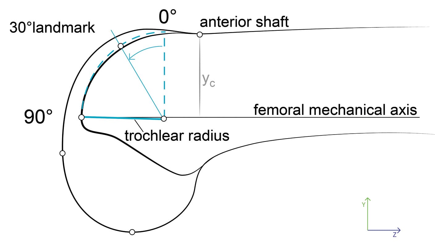 Studies demonstrated that in healthy knee, patellofemoral groove closely approximated a circular arc [4], Du Z, Chen S, Yan M, Yue B, Zeng Y, Wang Y (2017) Do size, shape, and alignment parameters of the femoral condyle affect the trochlear groove tracking? A morphometric study based on 3D- computed tomography models in Chinese people. BMC Musculoskelet Disord 18:1–7[7], Iranpour F, Merican AM, Dandachli W, Amis AA, Cobb JP (2010) The geometry of the trochlear groove. Clin Orthop Relat Res 468:782–788[11], O’Connor JJ, Shercliff TL, Biden E, Goodfellow JW (1989) The geometry of the knee in the sagittal plane. Proc Inst Mech Eng Part H J Eng Med 203:223–233[17] Wang J, Yue B, Wang Y, Yan M, Zeng Y (2012) The 3D analysis of the sagittal curvature of the femoral trochlea in the Chinese population. Knee Surg Sports Traumatol Arthrosc 20:957–963. The trochlear groove points were fitted by a circle in a range from 0° to 90°. The best-fit was found using a software routine that minimized the root mean-square error in relation to the acquired points. The trochlear groove varus-valgus and internal–external orientations as well as the starting and end points of the groove were even evaluated.