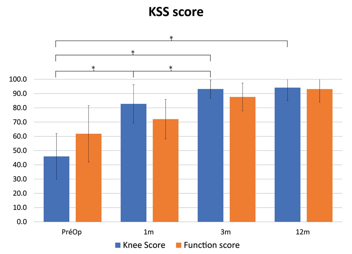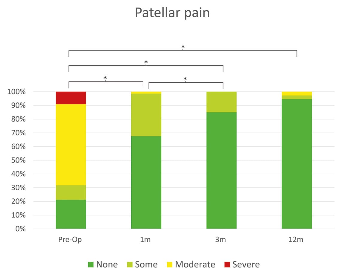 Clinical follow-up showed reduction of patellar pain, with more than 60% of patients reporting no pain since first month. After 3 months patellar pain remained stable (Fig.4). Similarly, KSS knee and functional scores improved at early follow-up. In particular Knee score reached optimal (>80) results at 1m follow up (Figure 5).
