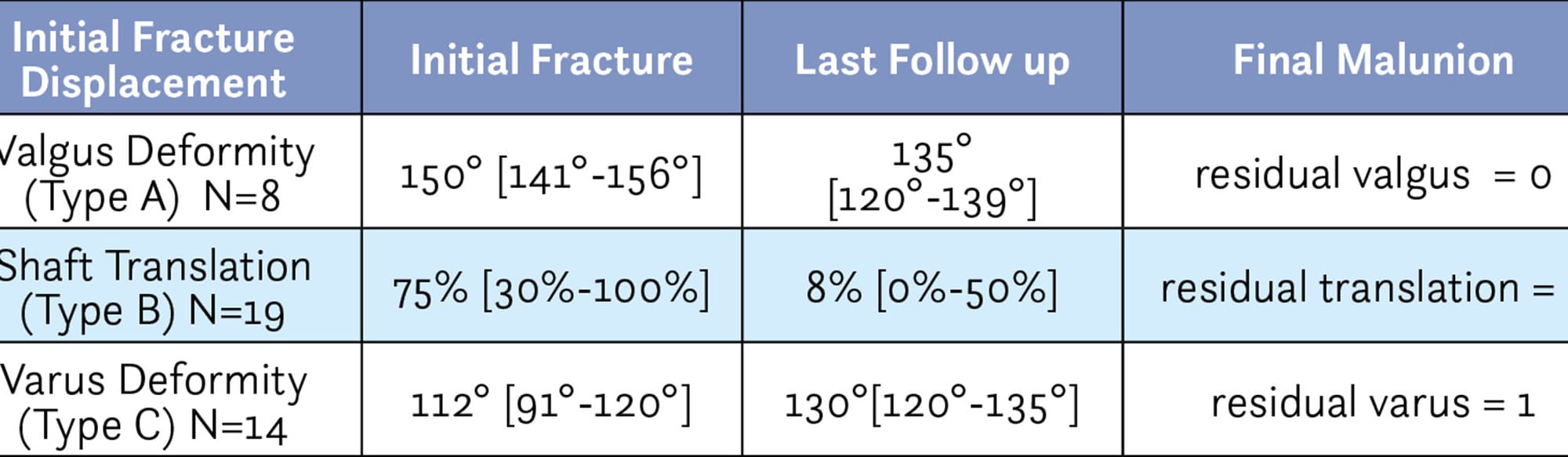 - Valgus Surgical-Neck Fractures (Type A- 8 cases): the medial translation of the diaphysis is partial and combined with some abduction which leads to valgus deformity of the humeral head.