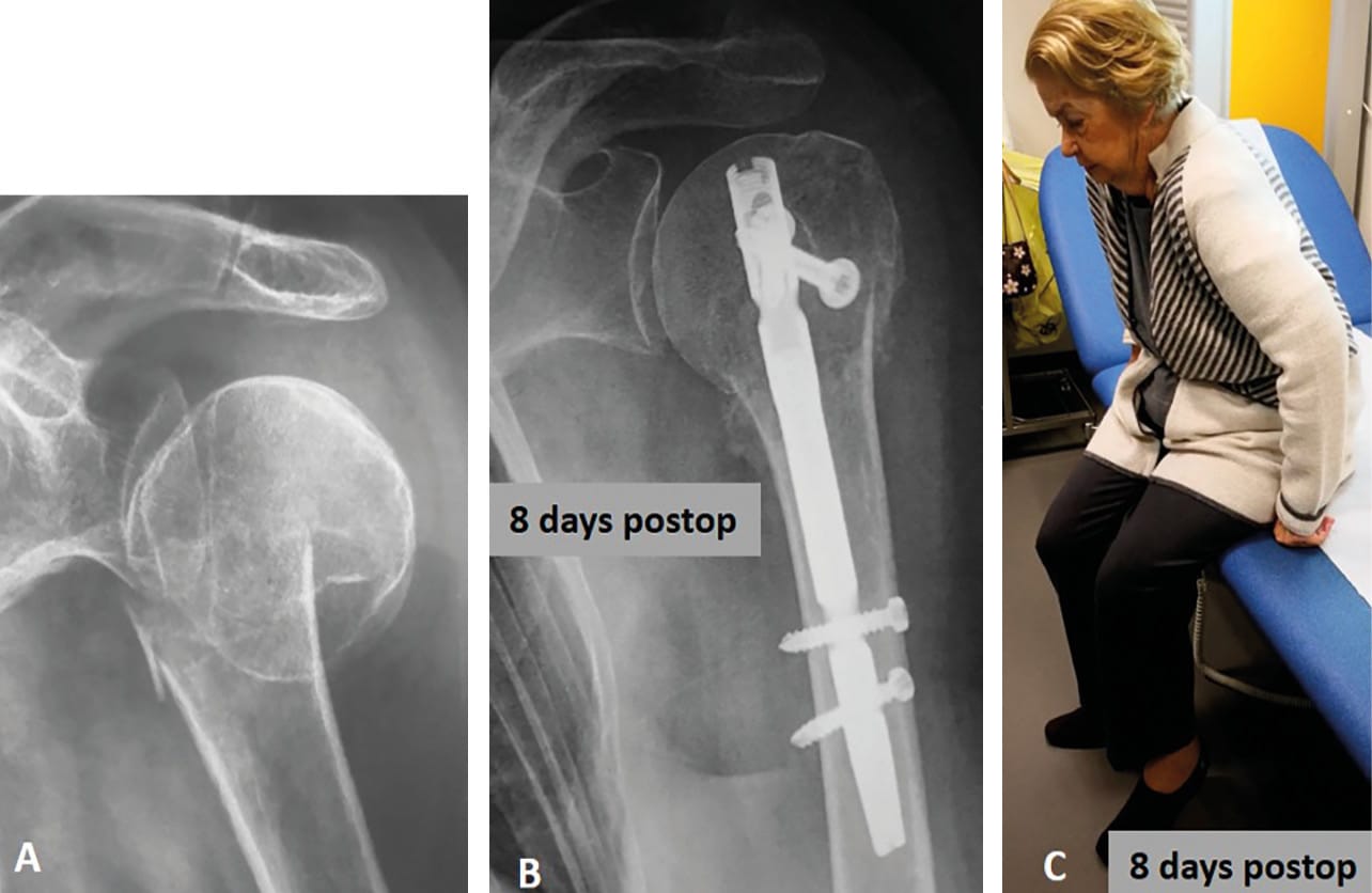 From a technical standpoint, optimal entry point for the nail is of paramount importance and must be based on the displacement of the humeral head fragment: the nail should enter more lateral in case of valgus tilt and more medial in case of varus tilt. The use of intraoperative fracture site impaction (“backslap” technique) reinforces the construct and allows immediate activity and rehabilitation.