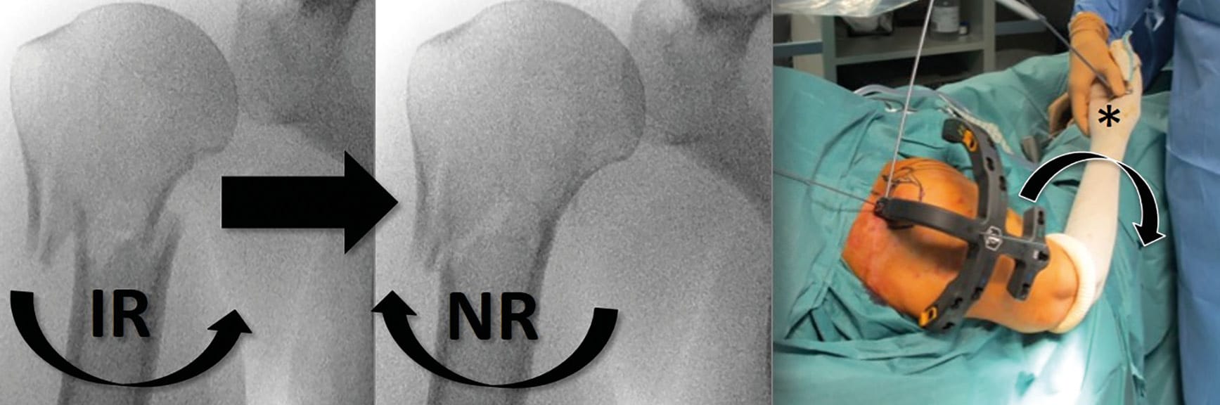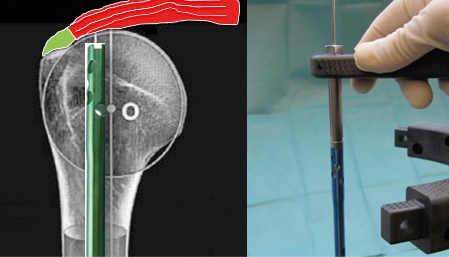 Once adequate guide pin placement is achieved, a 9-mm hole is created in the humeral head using a cannulated reamer. The cannulated nail is placed over the guide wire, inserted at the apex of the humeral head, and then inside the diaphysis, providing appropriate fracture alignment. The arm is placed in neutral rotation to achieve adequate derotation of the humeral diaphysis, whereas adequate rotation of the nail is achieved with the assistance of an external jig aligned with the forearm (Figure 4).