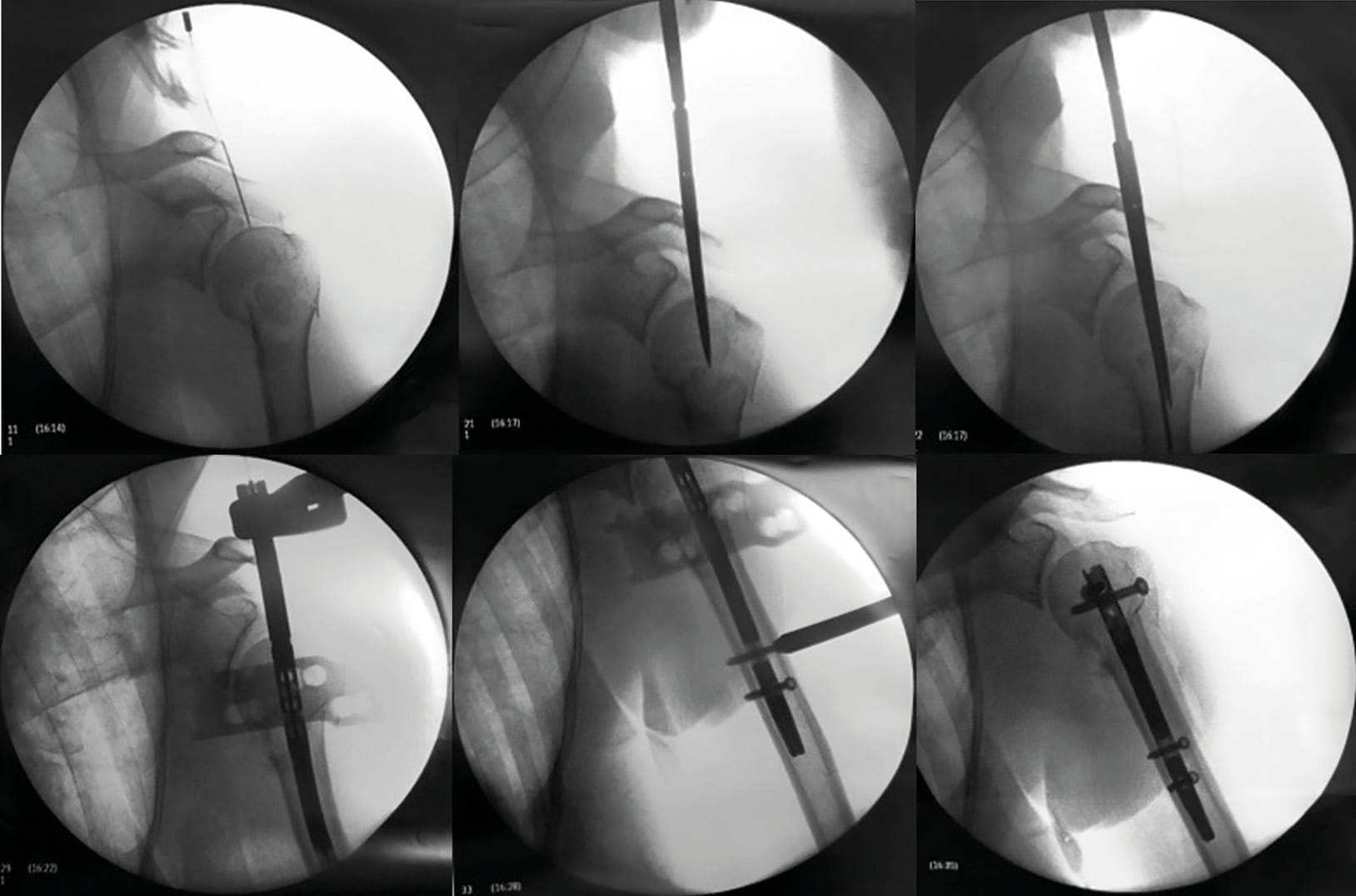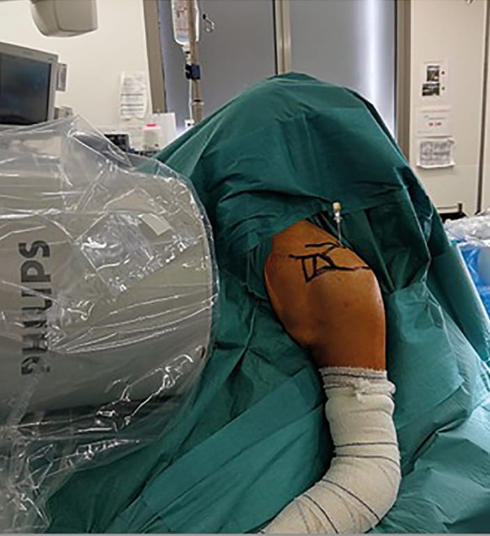 Patients are placed in the sitting position and the C-arm image intensifier control, approaching from the contralateral side of the table to visualize the proximal humerus, is placed orthogonal to the shoulder (Figure 2). The goal of the minimally invasive percutaneous technique is to enter the cartilage of the humeral head (entering the supraspinatus muscle fibers, not the tendon) before entering the medullary canal of the diaphysis to align the head fragment and the shaft, and then to derotate the diaphysis (Figure 3).