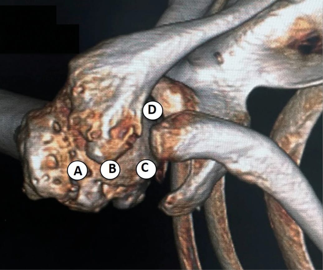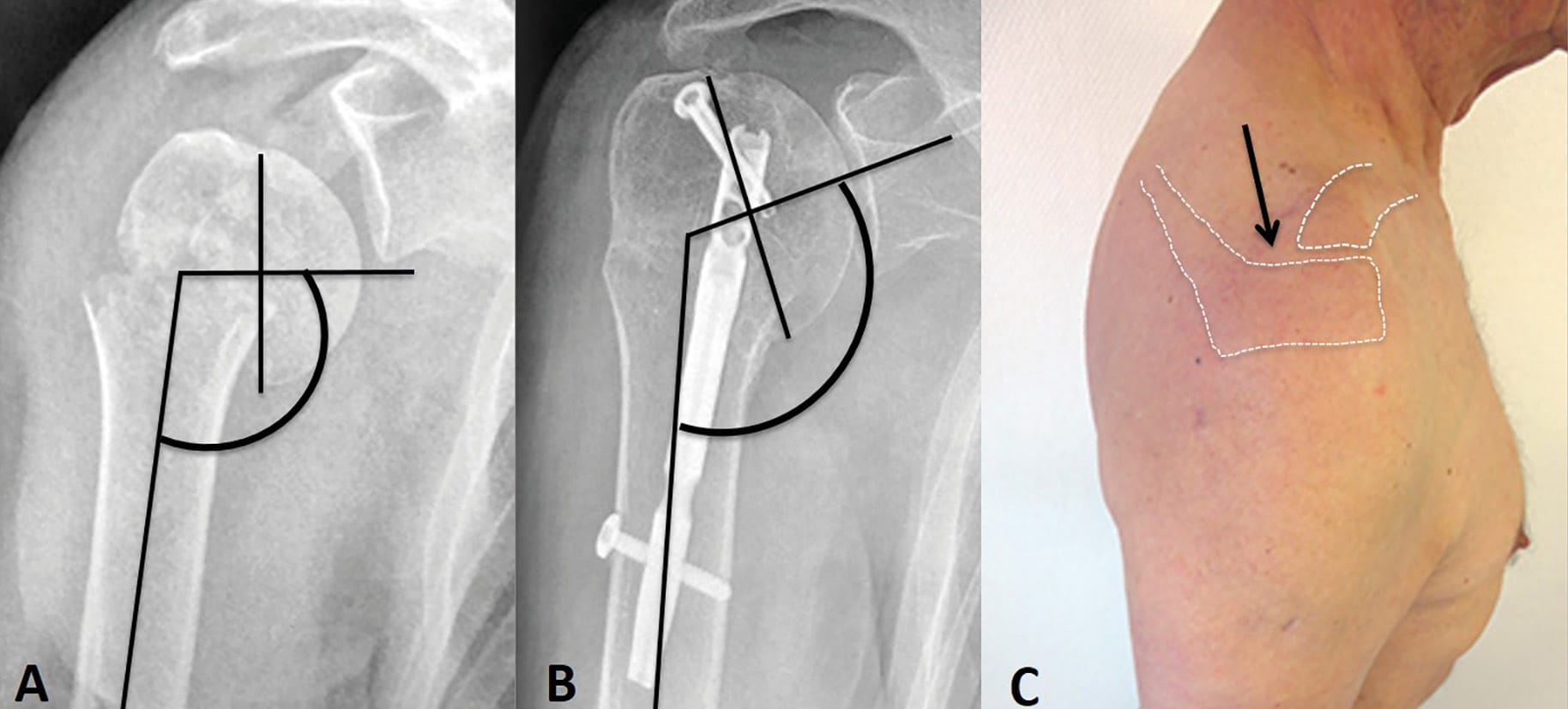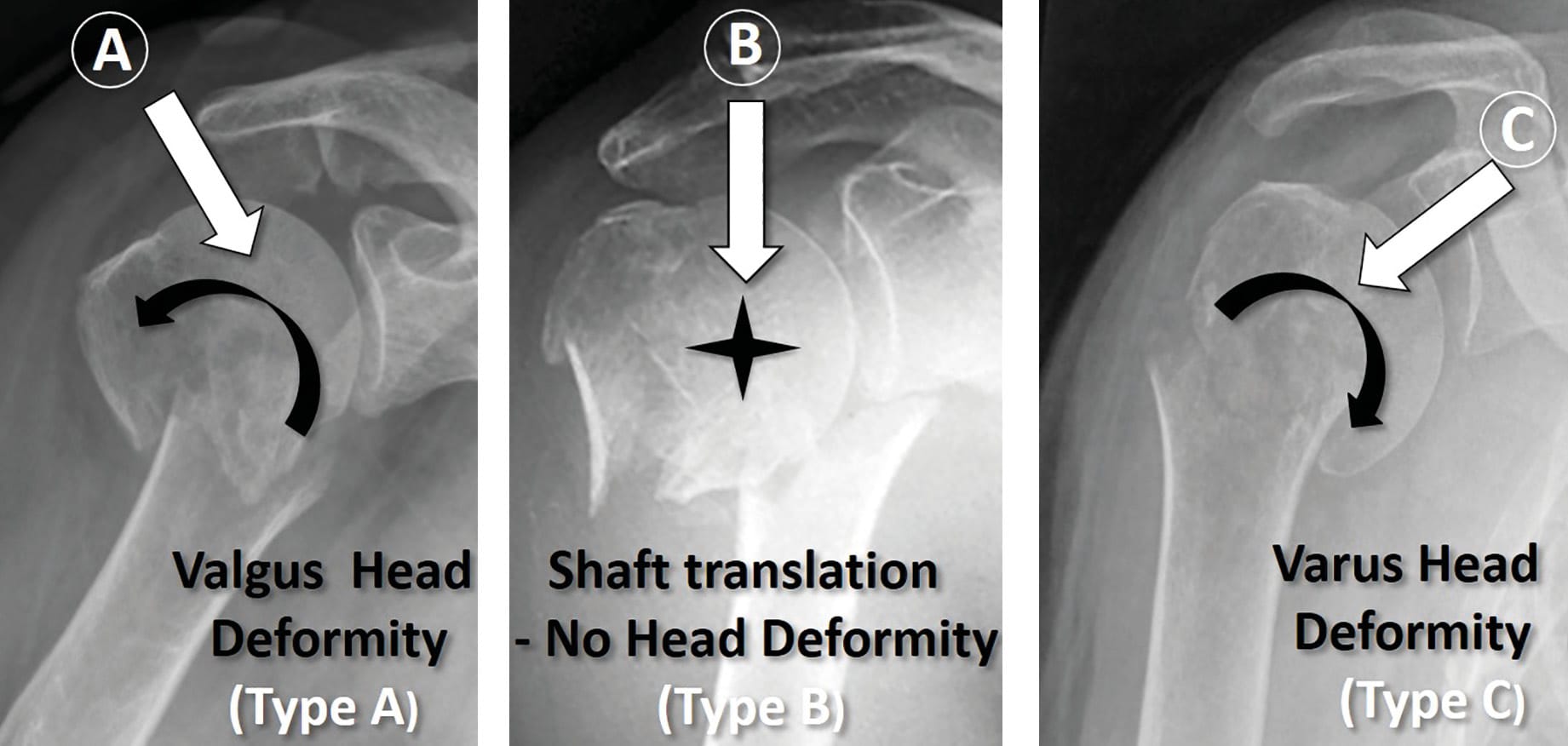 - Varus Surgical-Neck Fractures (Type C- 14 cases): the shaft is translated laterally with some adduction, leading to varus head deformity.