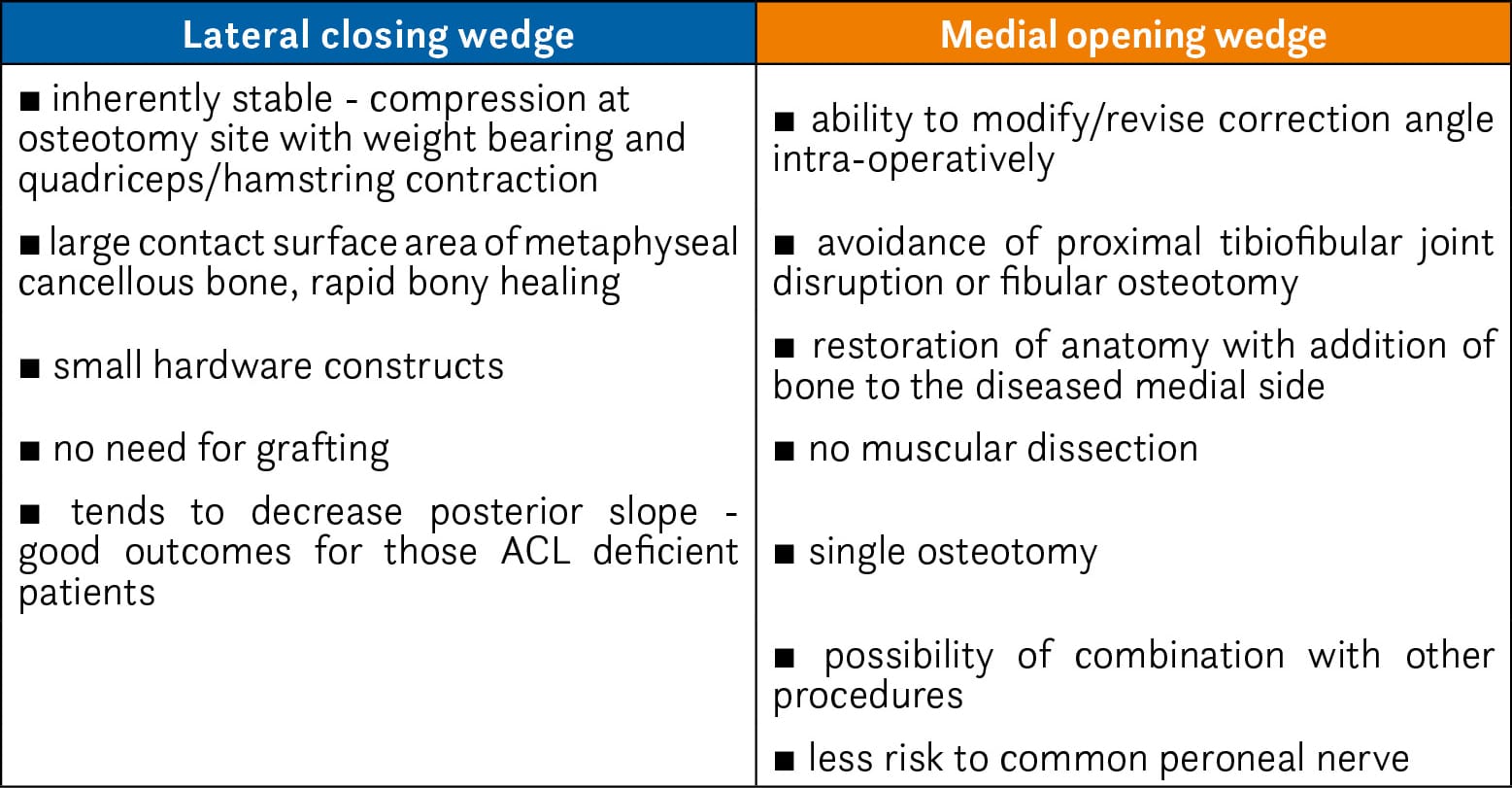 The compared advantages of lateral-closing and medial-opening wedge HTO techniques are presented in Table 1.